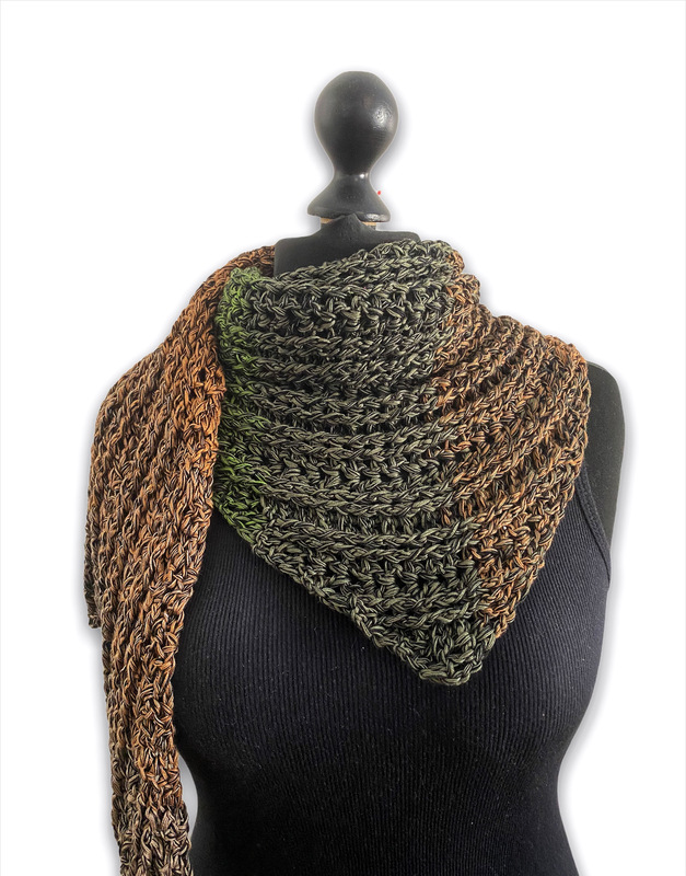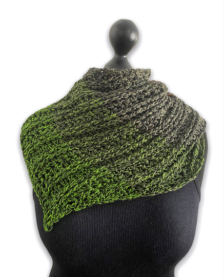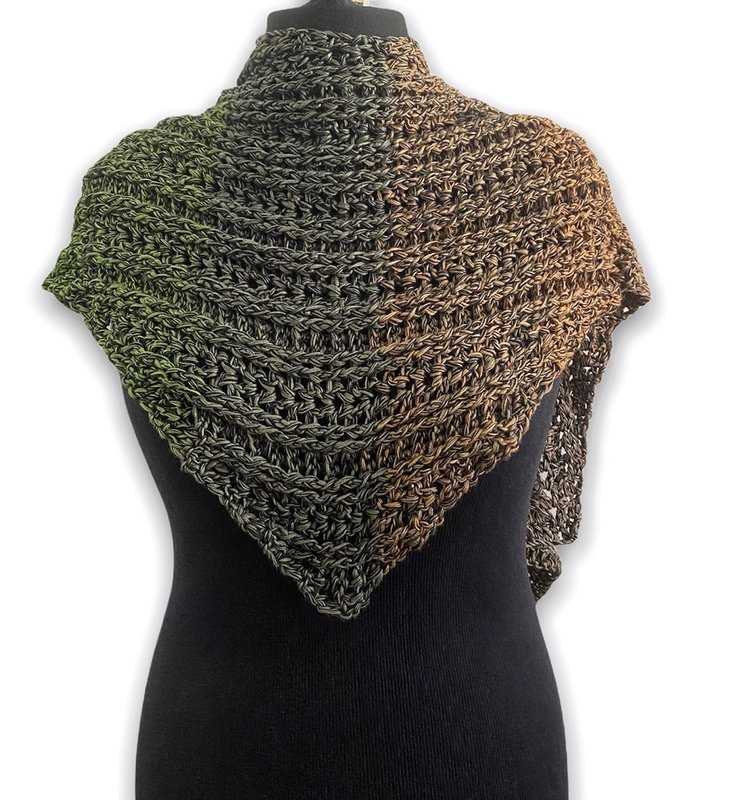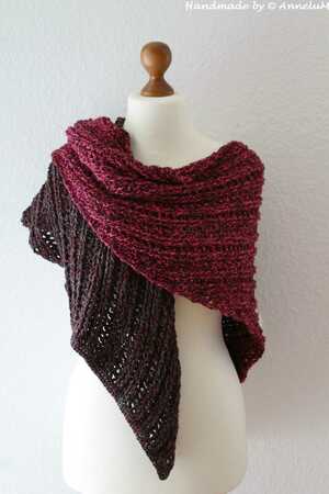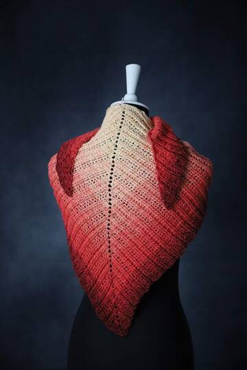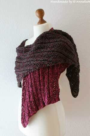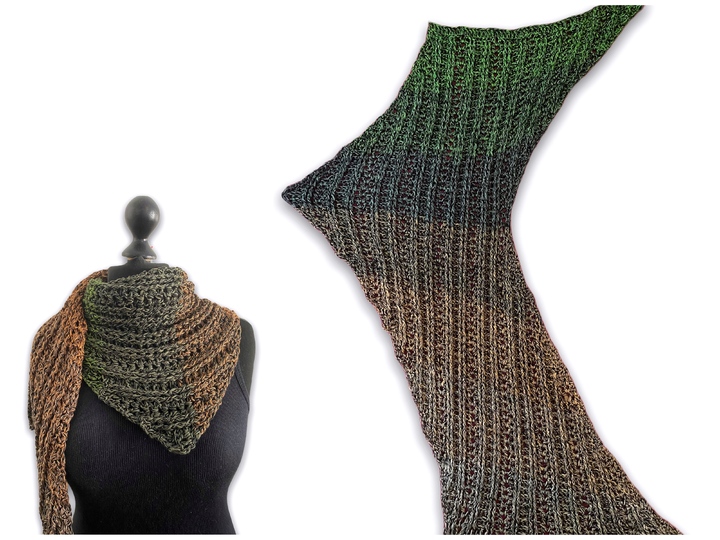 Vinosti ist ein Tuch das ihr auf zwei verschiedene Weisen häkeln könnt. Entweder als Schaltuch mit Spitze in der Mitte oder als einfachen schräg verlaufenden Schal. Es gibt bei dem Muster keine Vorher- bzw. Rückseite. Beide Seiten haben durch die Reliefstäbchen eine schöne Optik.