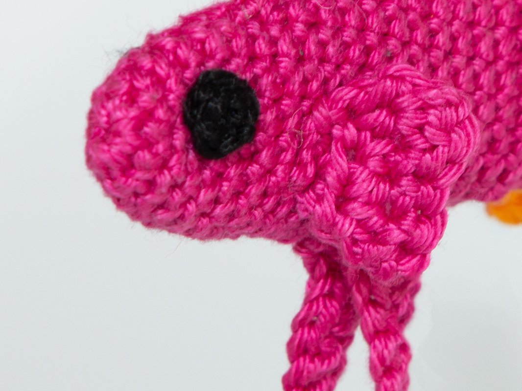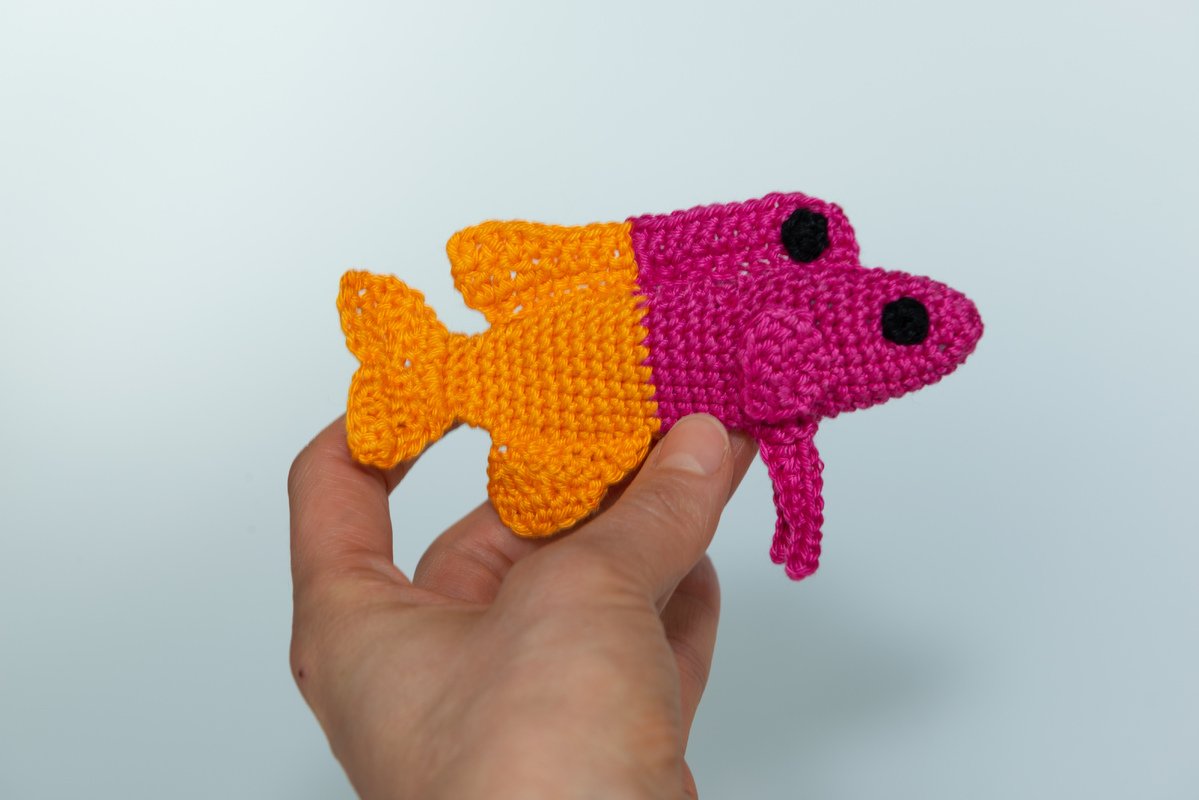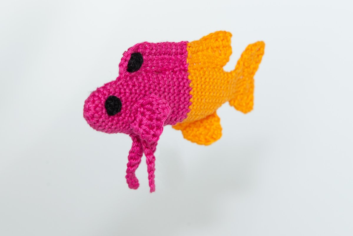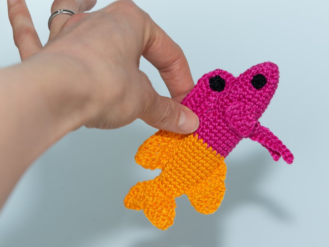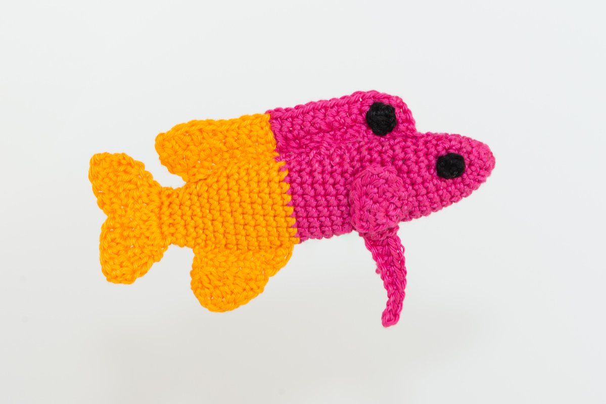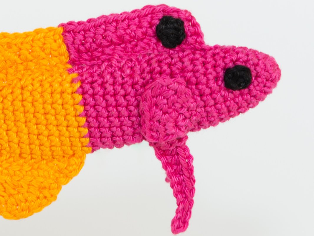 Dann werden Brustflossen und Seitenflossen separat gehäkelt und an den Körper genäht. Anschließend wird die Rückenflosse gehäkelt. Diese ist zunächst in die zwei Farben Pink und Gelb unterteilt und wird dann aneinandergenäht. Der Punkt auf der Rückenflosse wird ebenfalls separat gehäkelt und links und rechts auf die Rückenflosse genäht.