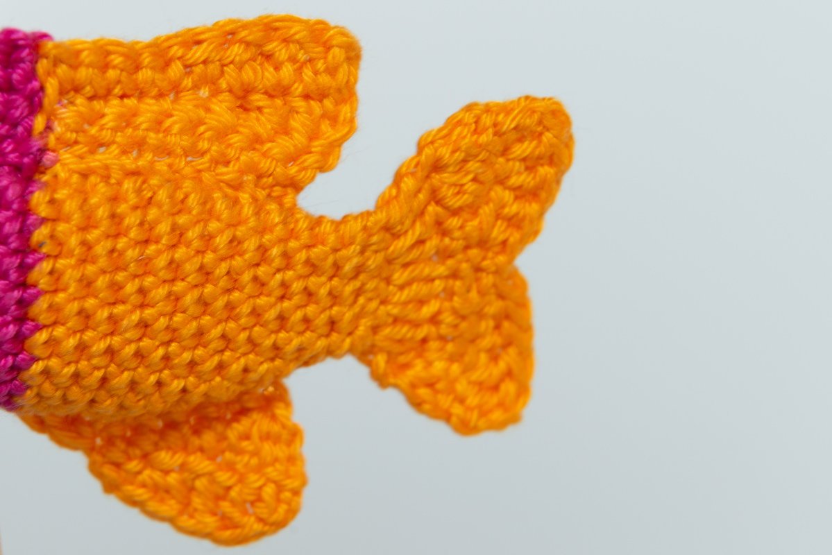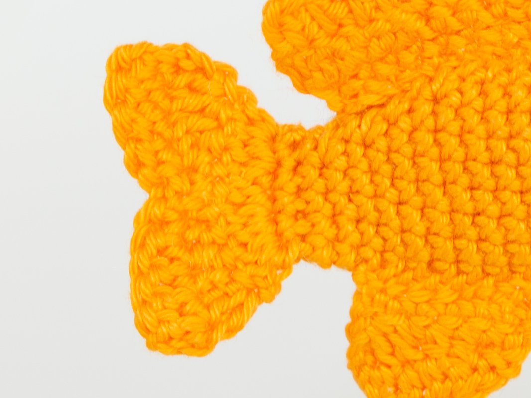 Zum Schluss wird die Afterflosse gehäkelt und ebenfalls auf den Körper genäht. Abschließend werden alle überstehenden Fäden vernäht.