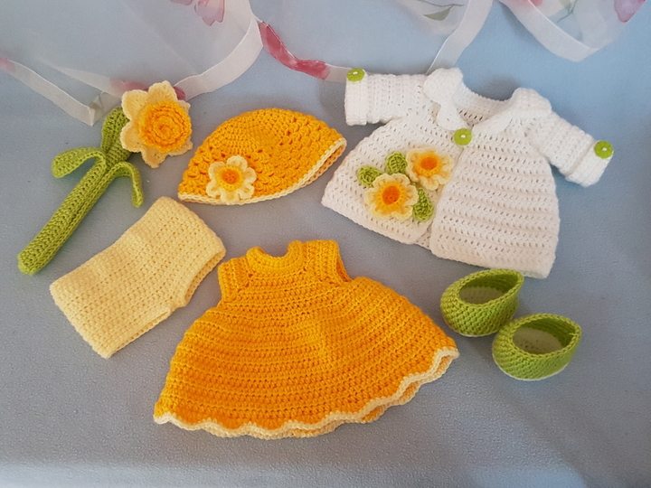 Die PDF beinhaltet die Anleitung für das Kleid, die Schuhe, den Mantel, das Unterhöschen sowie für die Sommermütze und die große Narzisse.