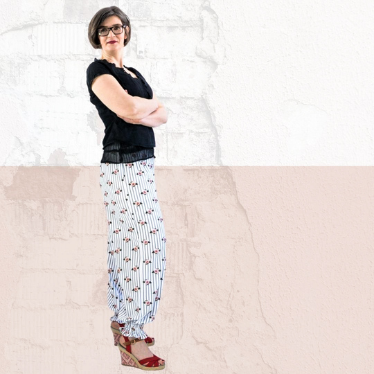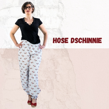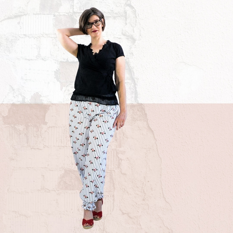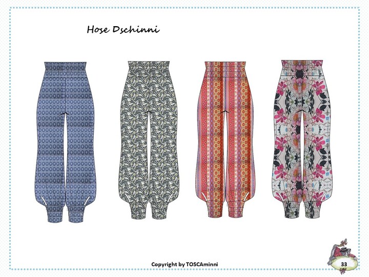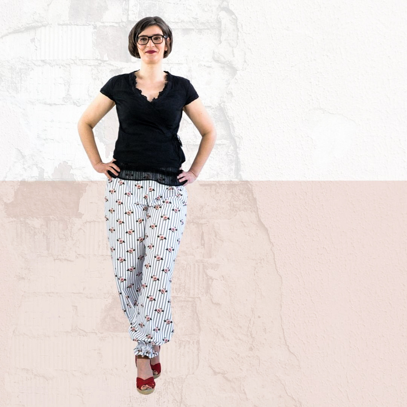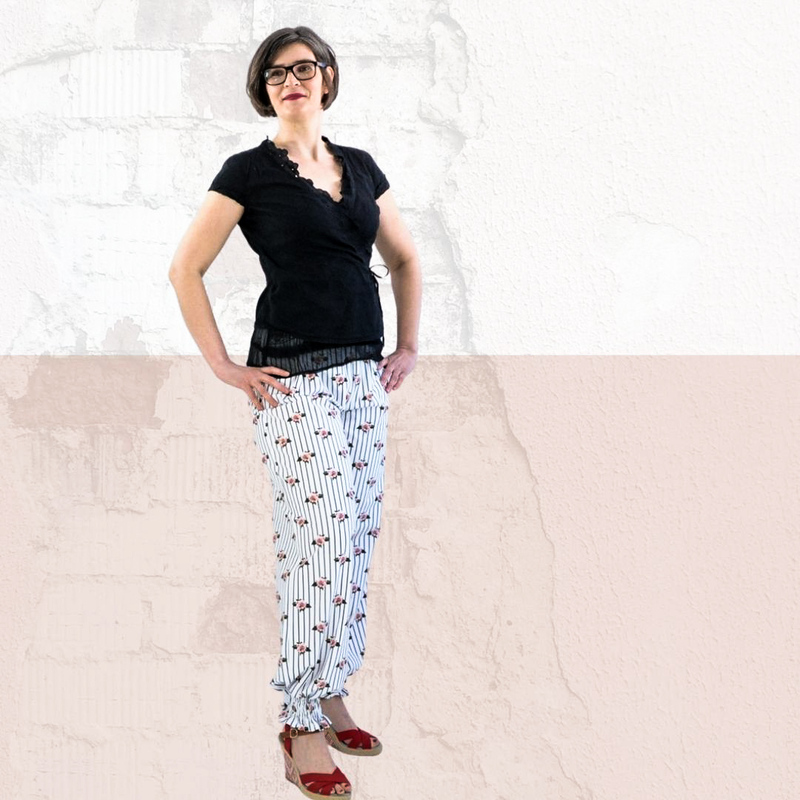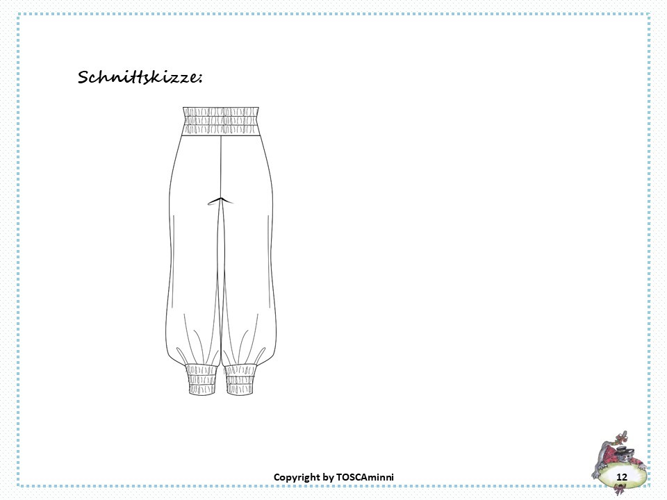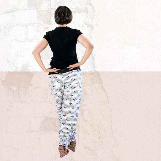 Schnittmuster für eine Sarouelhose, superbequem und trotzdem schick. Die Hosenbeine sind gesmokt, ebenso oben der Bund, so dass die Hose richtig gut sitzt.