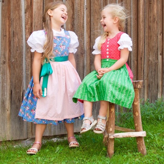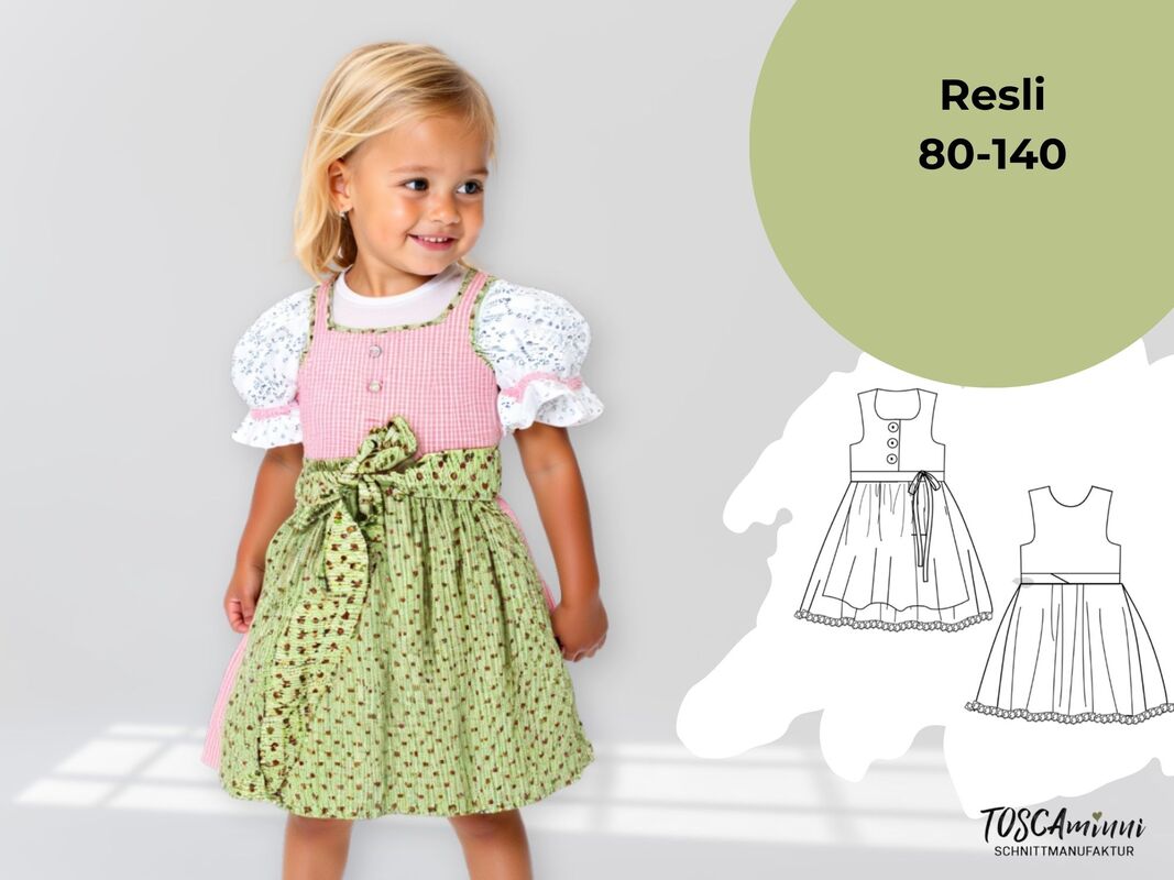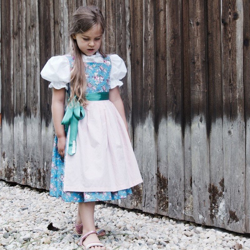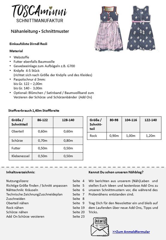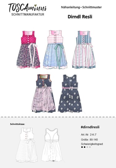 Ein Schnittmuster für ein bezauberndes Kinder Dirndl aus dem Hause TOSCAminni. Das Oberteil wird wie bei einem Erwachsenen Dirndl traditionell mit Paspeln genäht. Für das Dirndl kannst Du klassische Trachtenstoffe verarbeiten aber natürlich auch moderne Blumenstoffe, oder punkige Webstoffe. Um das Dirndl in Szene zu setzen bietet es sich an, besonderes Augenmerk auf die Schürze zu wenden, in dem Du für die Schürze Taftbänder verarbeitest. Natürlich lassen sich auch die Bindebänder wunderbar dekorieren. Anregungen erhältst Du dazu in der ausführlichen Anleitung.