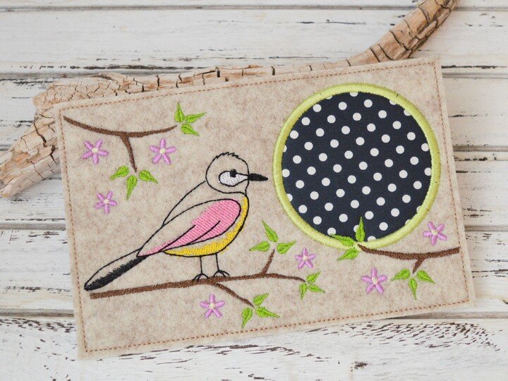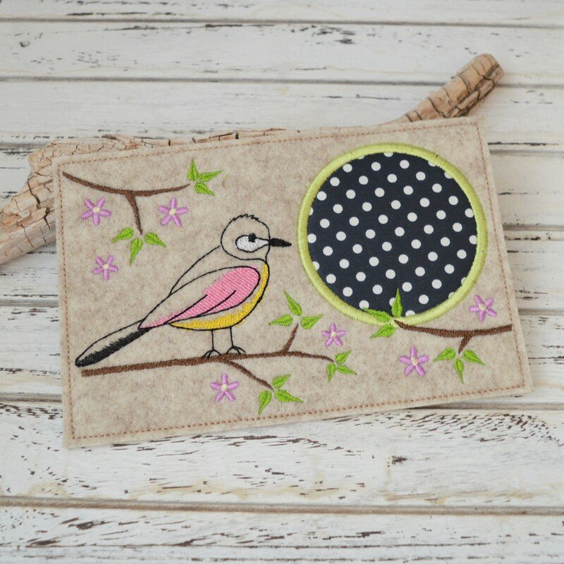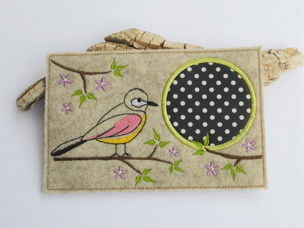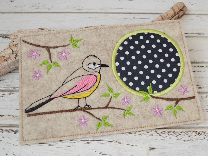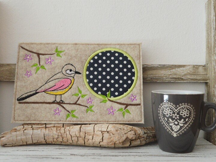 Frühlingshafter Untersetzer mit Vogel und Blüten.