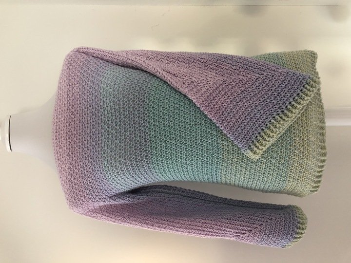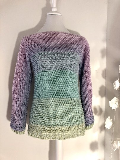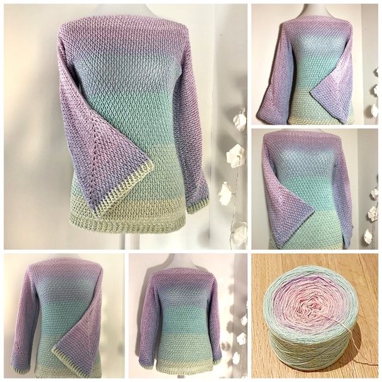 Je nach Garnauswahl, kann man den Pullover in jeder Jahreszeit tragen. Besonders gut eignen sich hier Farbverlaufsgarne, weil er mit einem Rutsch von der Häkelnadel hüpft.