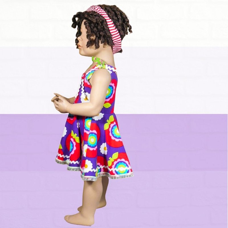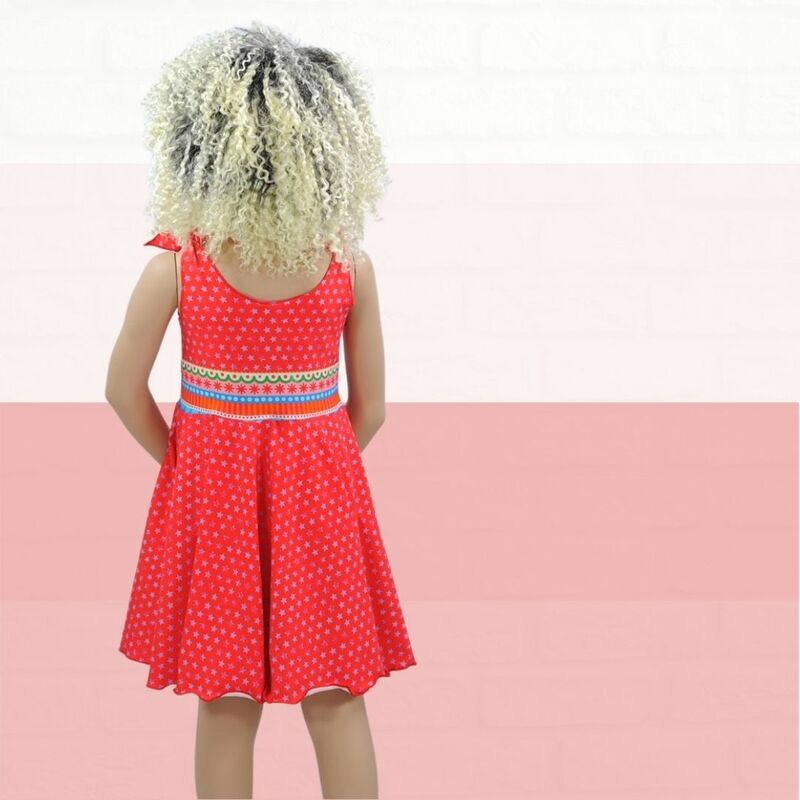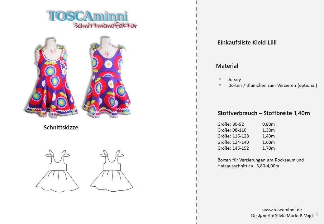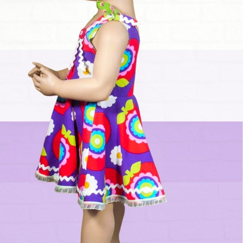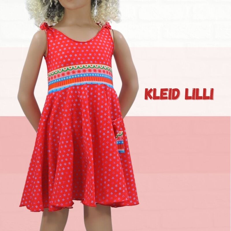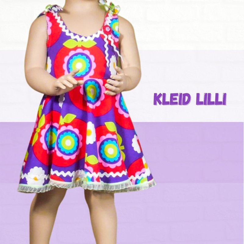 Mit dem Schnittmuster Lilli nähst Du Dir ein freches Sommerkleid mit einem hübschen Tellerrock im Hippielook. Das Oberteil wird mit Belegen abgefüttert, die Träger sind zum Binden. Das Kinderkleid ist ganz schnell in ca. 1 Stunde genäht. Die Nähanleitung ist bebildert, so dass auch Anfänger den Schnitt nachnähen können. Eine Overlock wäre von Vorteil.