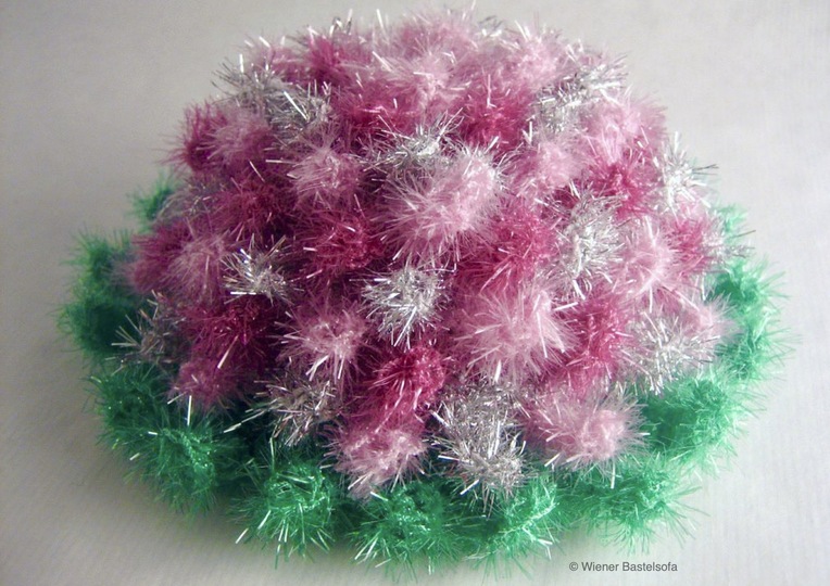 Die einzelnen Schritte werden genau mit vielen Fotos erklärt. Der Badeschwamm ist für Anfänger und Ungeübte geeignet. Es ist zwar etwas schwierig bei diesem „wuscheligen“ Garn die Maschen zu sehen, dafür verzeiht es aber auch Ungenauigkeiten und ein unregelmäßiges Maschenbild.
