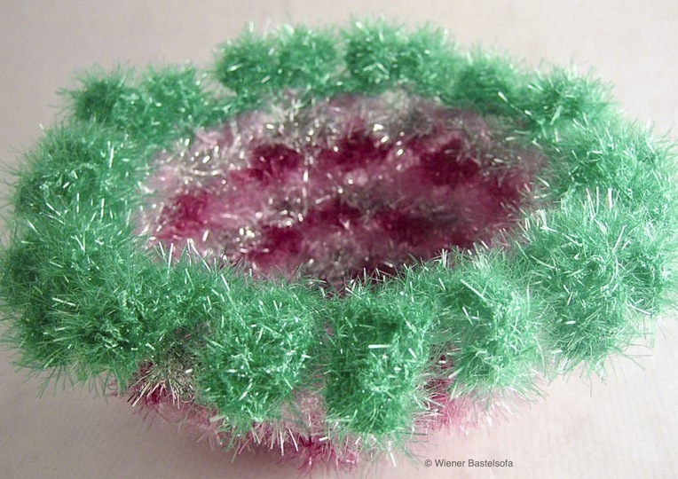 Gehäkelt wird aus dem Spülschwammgarn von Rico und ist laut Garnhersteller mit 60 Grad waschbar.