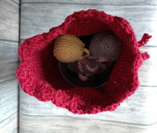 Für den Beutel 30 g Baumwollgarn in rosa, 35 g in rot, 10 g in hellgrün und in Reste in verschiedenen Farben ( sind ebenfalls in der Anleitung beschrieben.