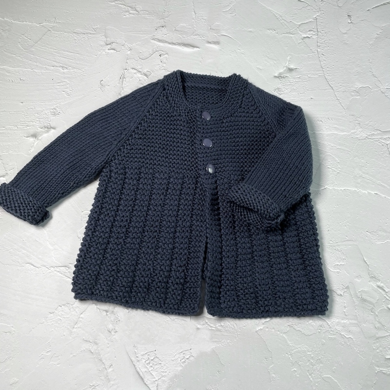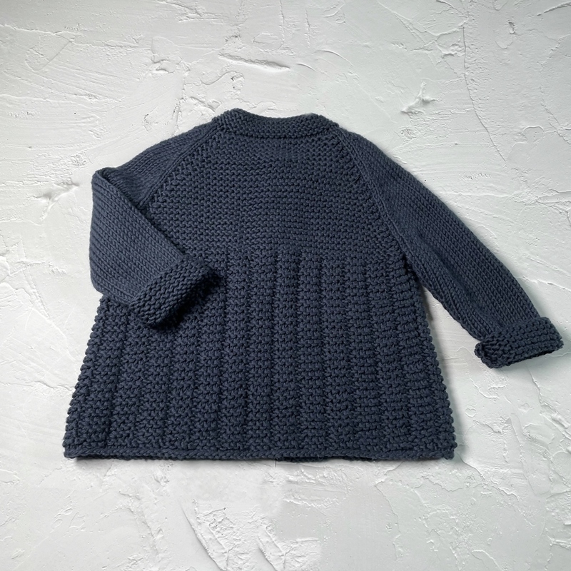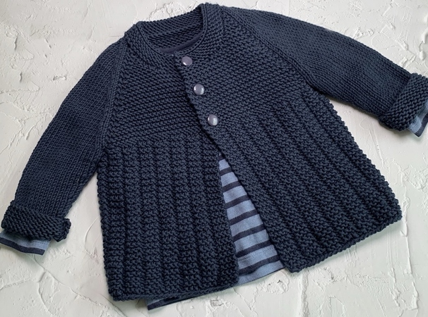 Bei dieser Baumwolljacke wird zuerst der Rumpf gestrickt, dann jedes Teil einzeln gestrickt und später aneinander genäht.