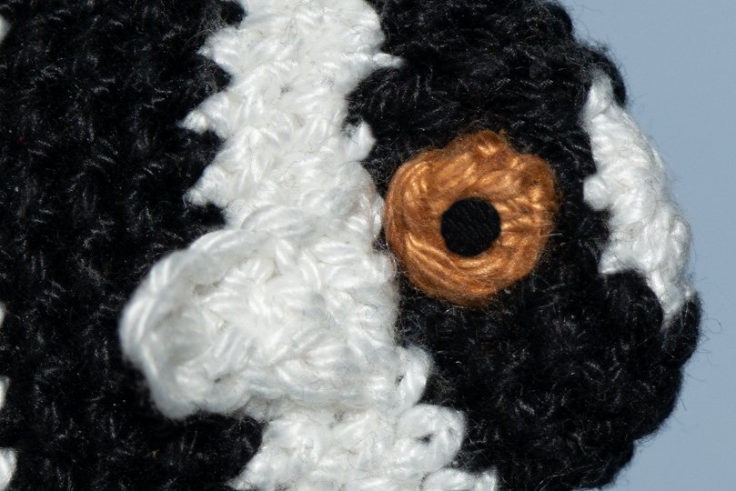 Dann werden Rückenflosse, Seitenflossen und Brustflossen sowie Afterflosse gehäkelt und an den Körper genäht. Anschließend werden die Augen gehäkelt und auf den Körper genäht. Die schwarzen Punkte in den Augen werden auf den Augapfel gestickt. Abschließend werden alle überstehenden Fäden vernäht.