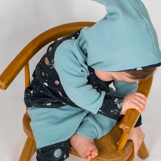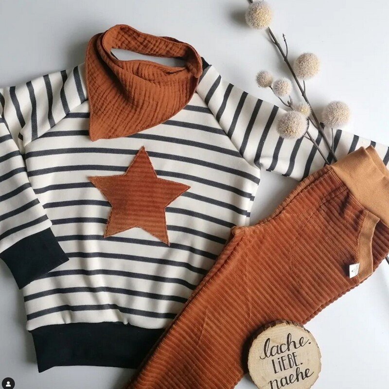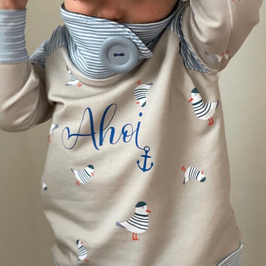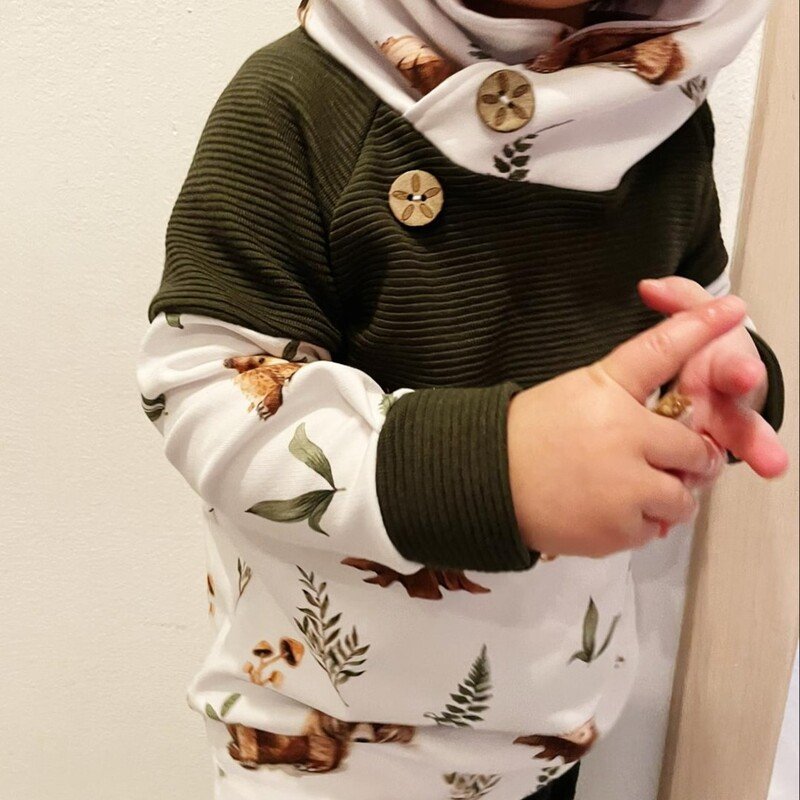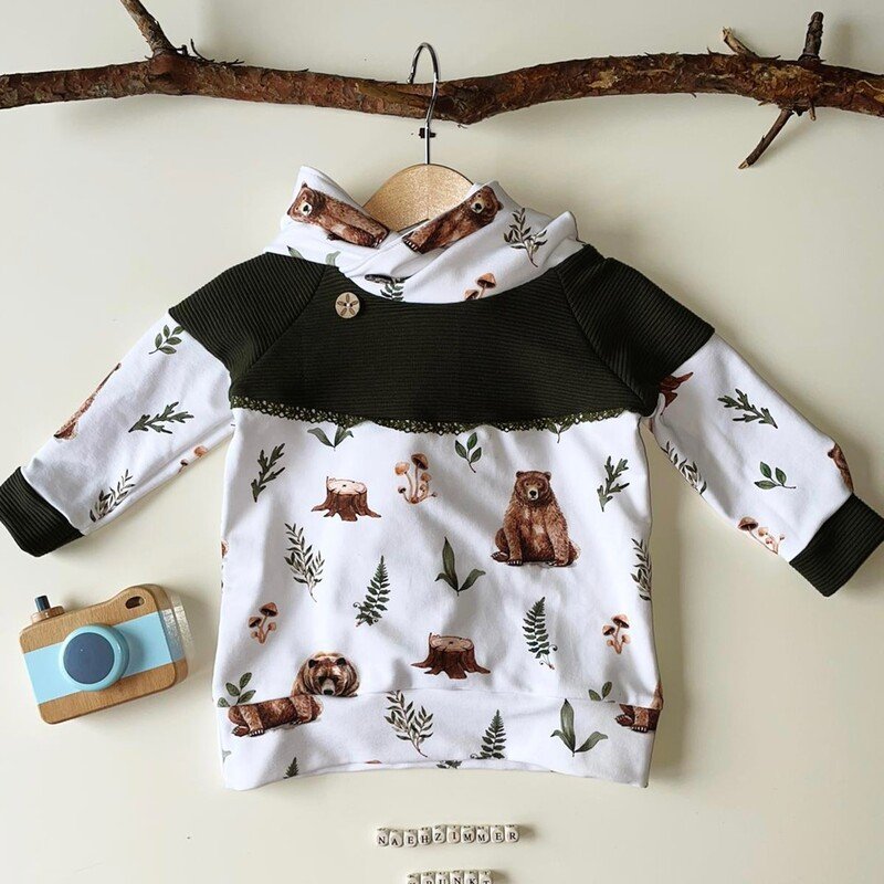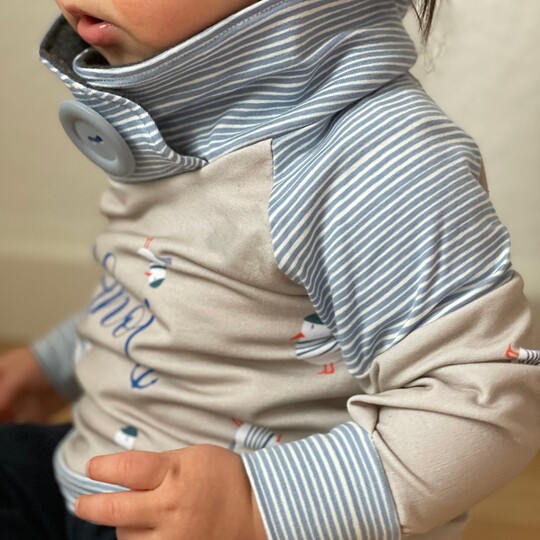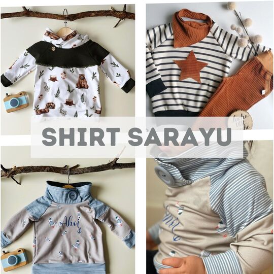 Mit dem Schnittmuster Sarayu nähst Du Dir einen pfiffigen Kinderhoodie aus Jersey. Der Hoodie ist sehr wandelbar und bietet vier Kragenvarianten – So kannst Du eine Zipfelkapuze/runde Kapuze abfüttern und wickeln, einen Wickelstehkragen oder eine ungefütterte Kapuze wählen. Das Shirt wurde mit Raglanärmeln konzipiert, so dass das komplizierte Einsetzen der Ärmel entfällt. Somit ist die Nähanleitung besonders Nähanfänger*innen geeignet. Die Ärmel werden mit Bündchen versäubert, alternativ kannst Du sie auch umschlagen.
