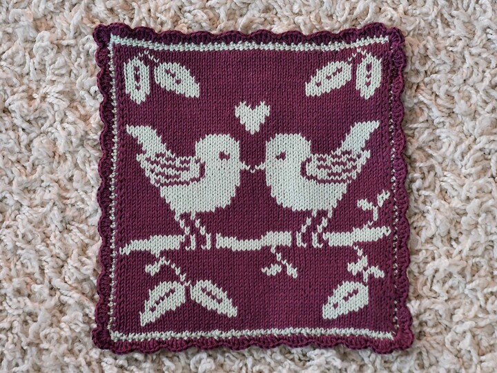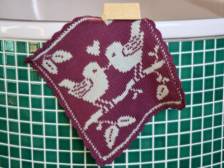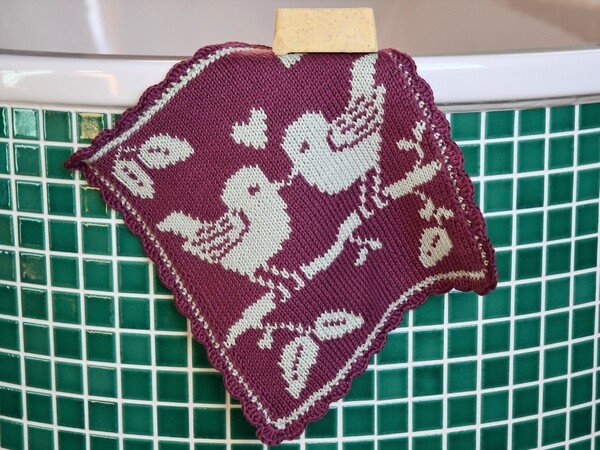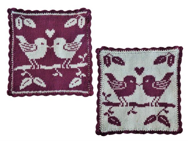 Wenn Du das Motiv in reiner Baumwolle strickst, kannst Du daraus natürlich auch Topflappen machen. Die beiden Love Birds sehen auch in der Küche toll aus.