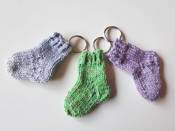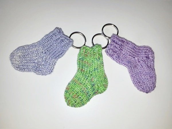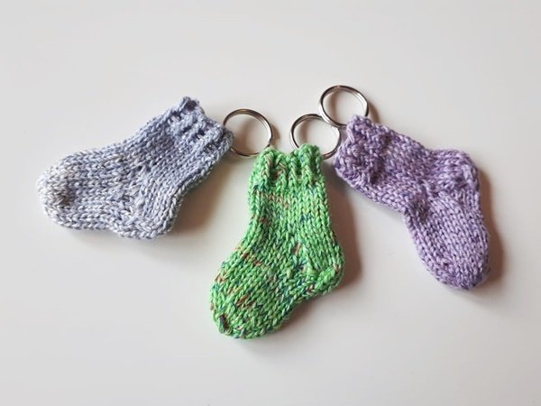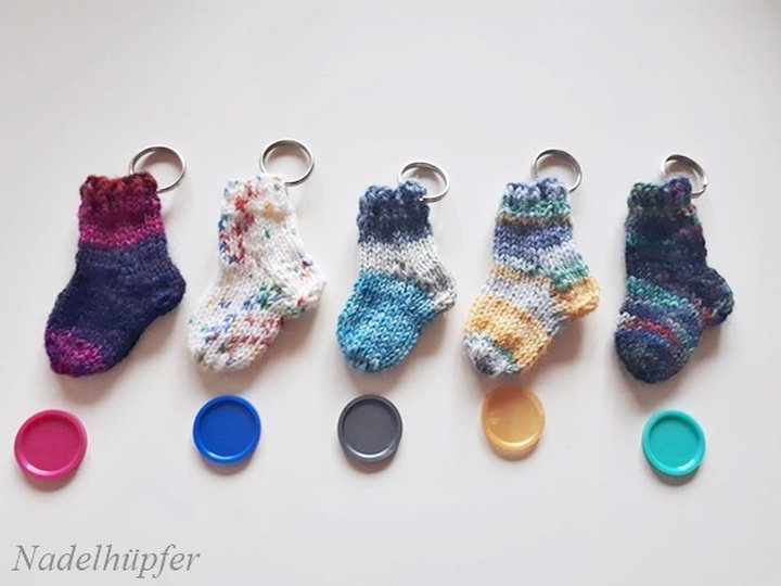Die fertigen Söckchen haben eine Größe von ca. 5cm. Je nachdem wie fest/locker gestrickt wird kann dies variieren.