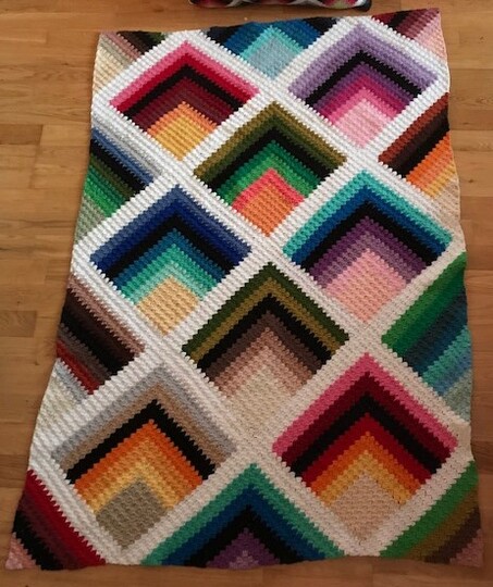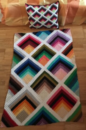 Ein Blickfang für jedes Bett oder Sofa. Eine gute Verwertung von Garnkäuel. Diese Decke ist aus einzelnen Knäuel hergestellt ausser bei der Grundfarbe. Kann in jede grösse gehäkelt werden.