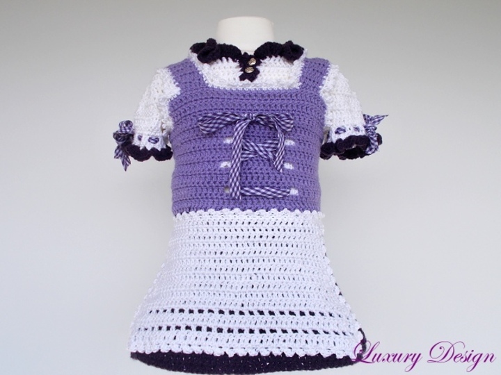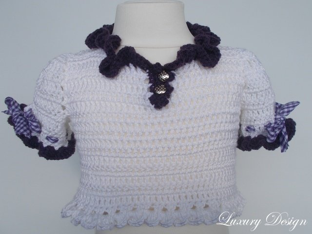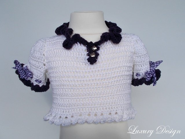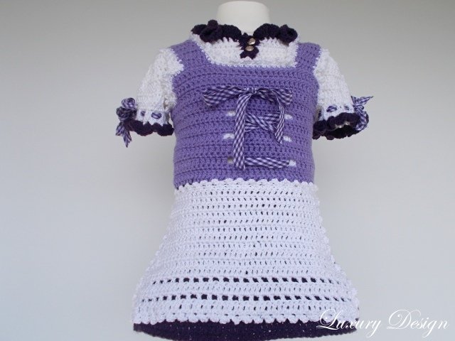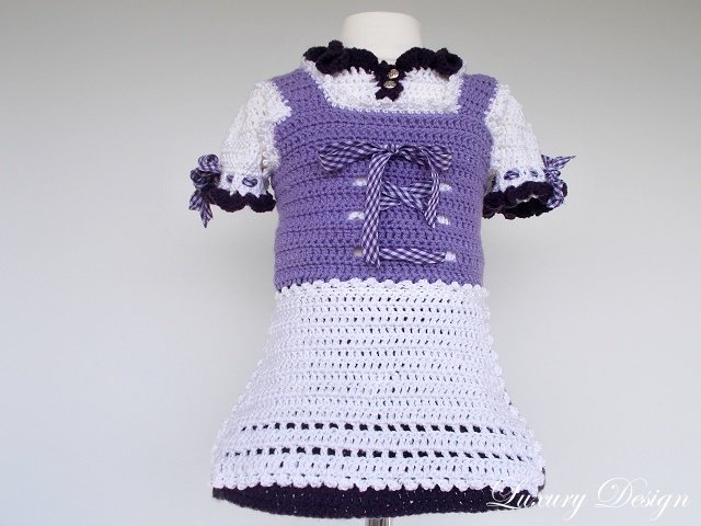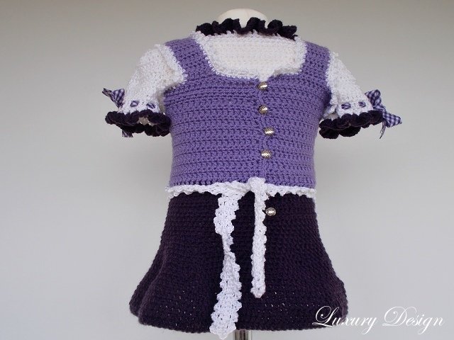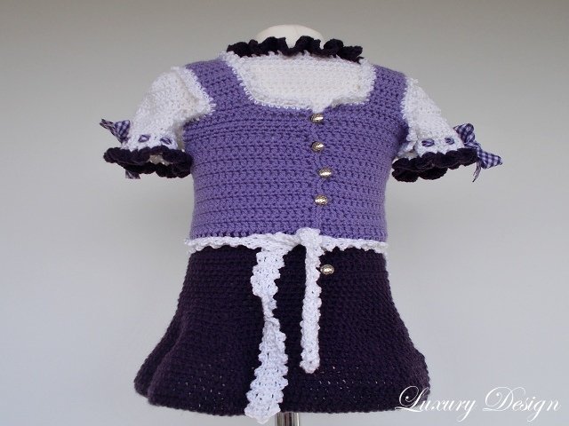 Wir benötigen Baumwolle oder Baumwollgemisch mit einer LL von 140m, Häkelnadel der Stärke 3,5, Satinband und Trachtenknöpfe.