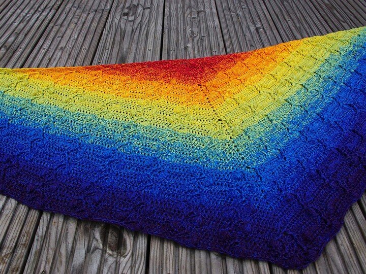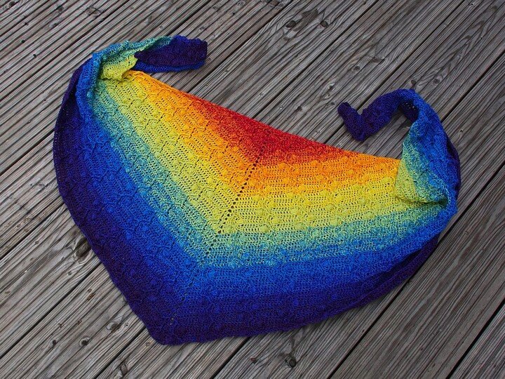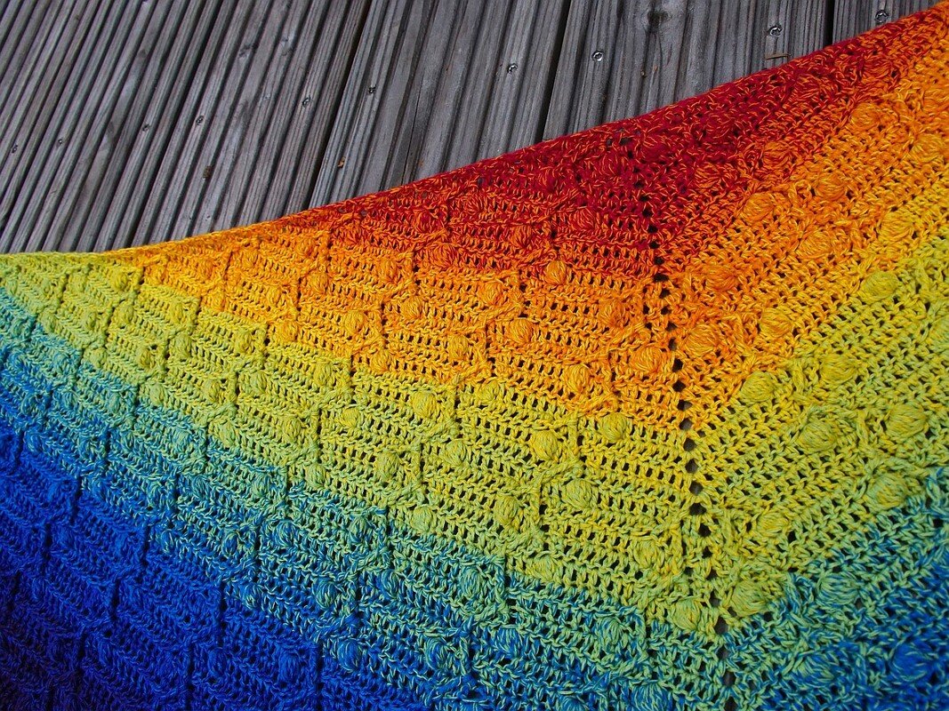 Das Tuch Springtime ist ein leuchtend bunter Hingucker in Regenbogenfarben. Es ist mit einem plastischem Ranken- und Knospenmuster verziert.