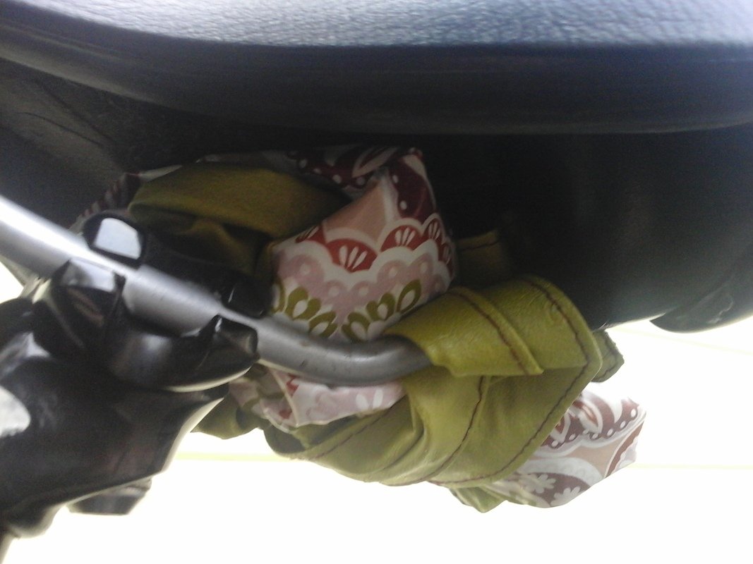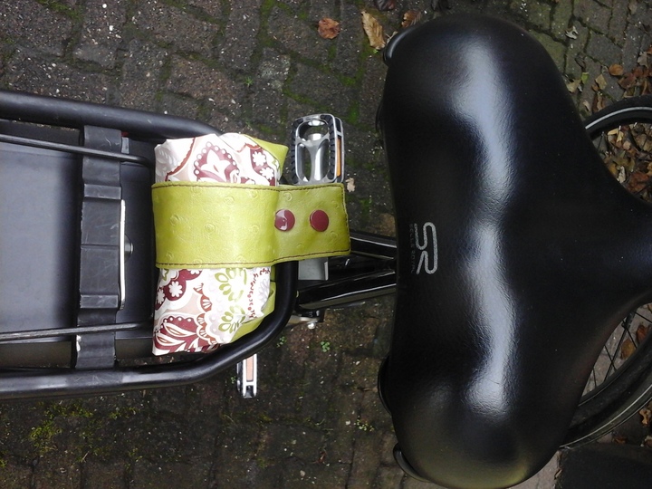 Mit der Befestigungsschlaufe mittels Druckknöpfe hat man diesen immer dabei. Er wird am Sattel oder Gepäckträger befestigt und bei schönem Wetter aufgerollt und am Gepäckträger oder unter dem Sattel verstaut.