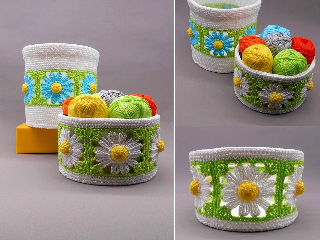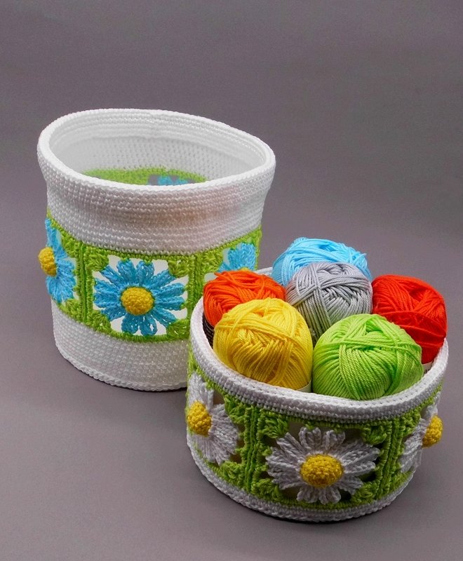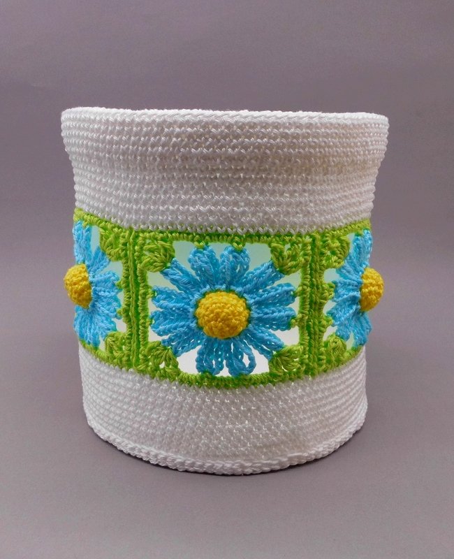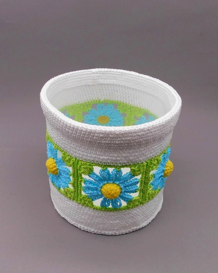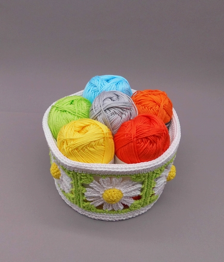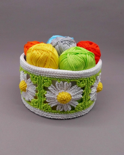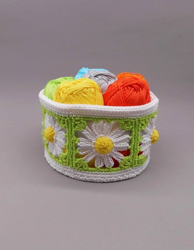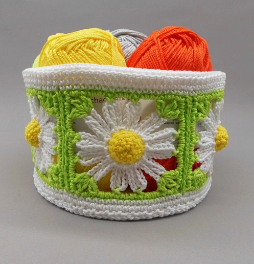 Der Korb mit der schönen Blumen-Bordüre aus Granny Squares ist ein hübscher Blickfang in Deinem Zuhause - und Du kannst ihn sehr vielseitig nutzen.