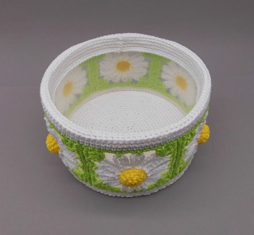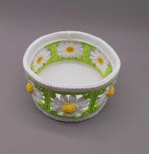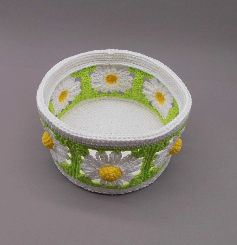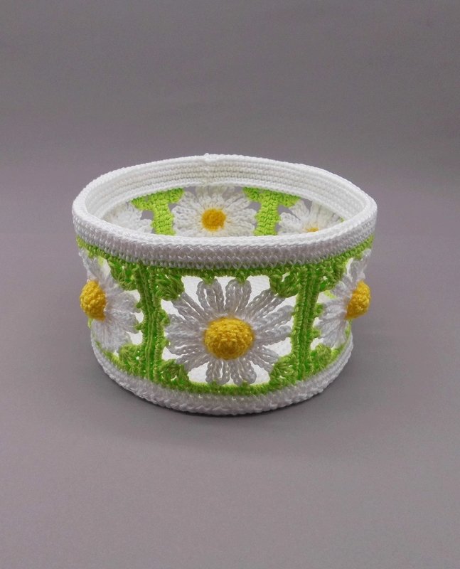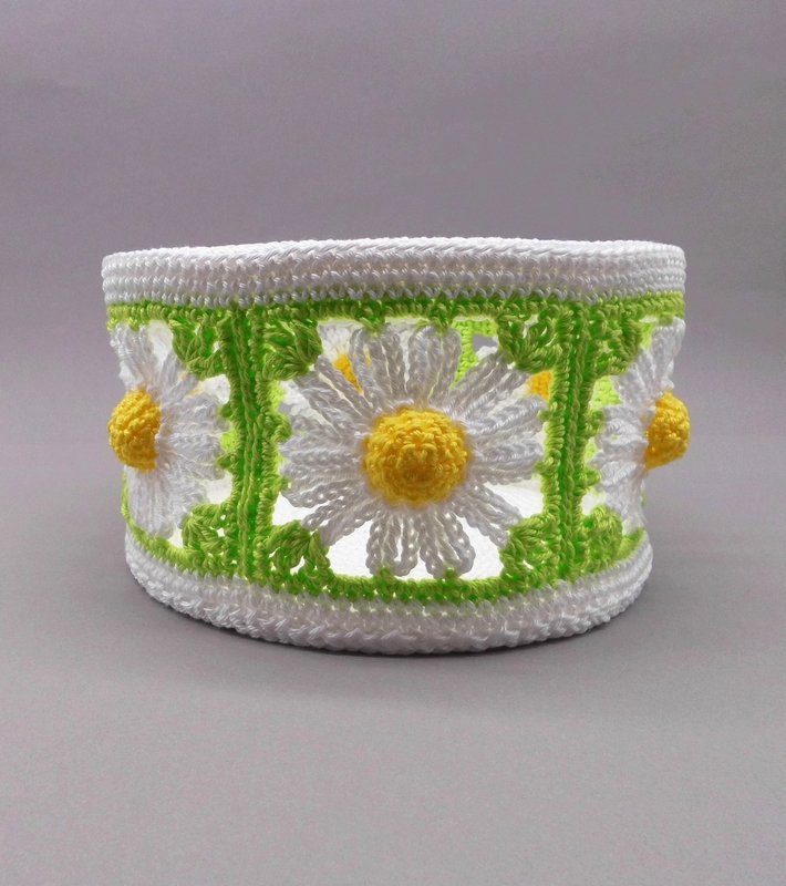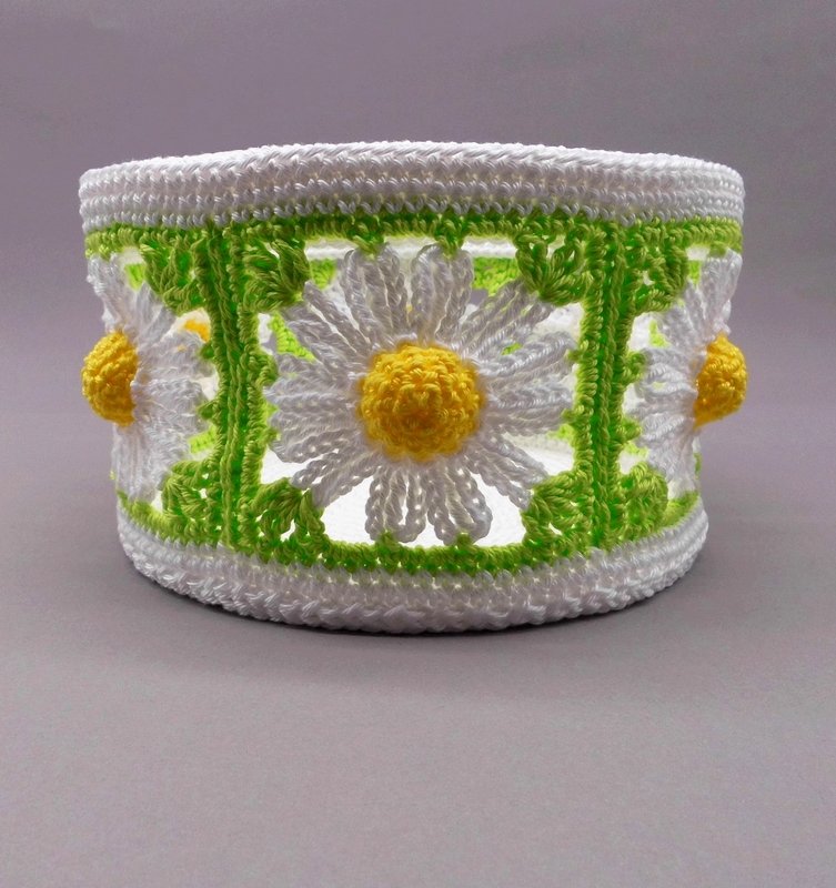 Ob als Utensilo für Allerlei im Badezimmer oder Schlafzimmer, auf dem gedeckten Tisch als Brotkorb, als Deko auf der Kommode oder der Fensterbank oder als vorläufiges Zuhause für Dein aktuelles Häkelprojekt: Der Korb mit den großen, fröhlich und unbekümmert wirkenden Blumen zaubert Dir bestimmt ein Lächeln ins Gesicht.