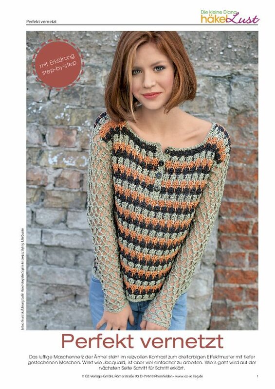 Das luftige Maschennetz der Ärmel steht im reizvollen Kontrast zum dreifarbigen Effektmuster mit tiefer gestochenen Maschen. Wirkt wie Jaquard, ist aber viel einfacher zu arbeiten. Durch den Poloverschluss erhält der tolle Baumwollpullover einen sportlichen Look.