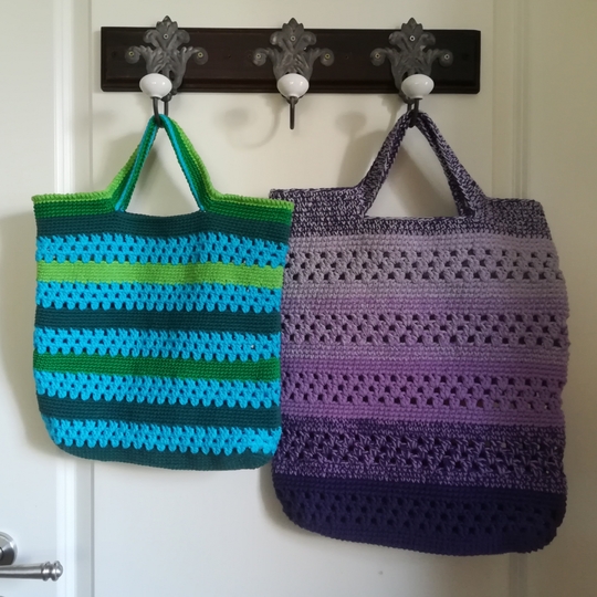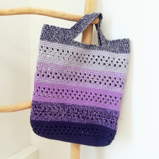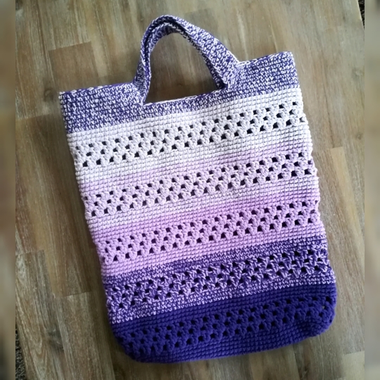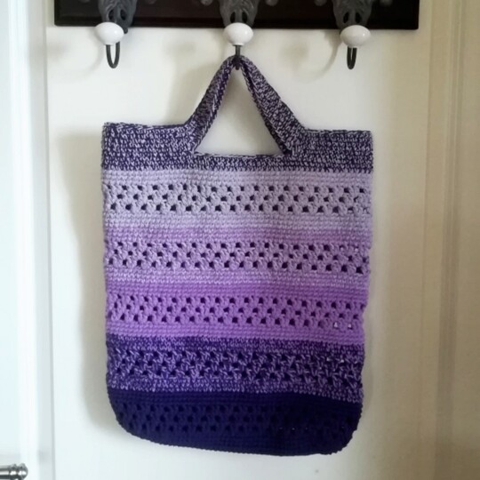 Die Paula in den Lila-Tönen hat ein Endgewicht von 480g, Baumwollgarn doppelt gehäkelt.