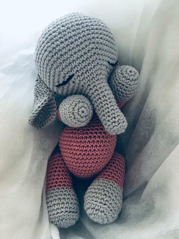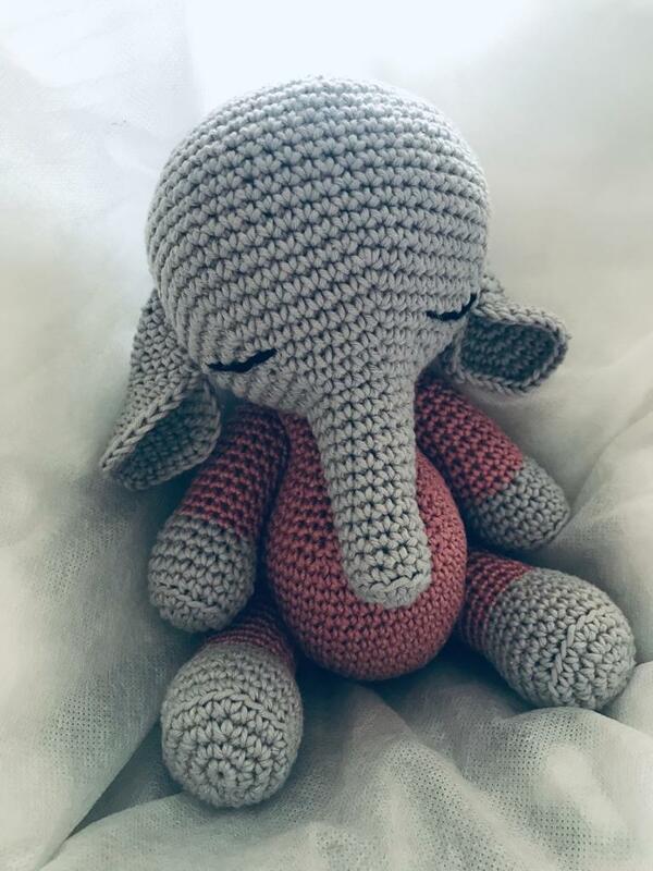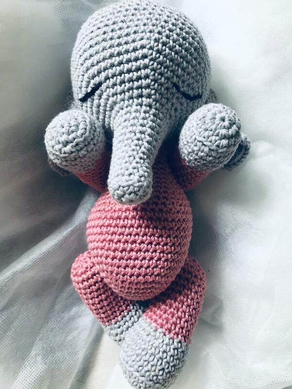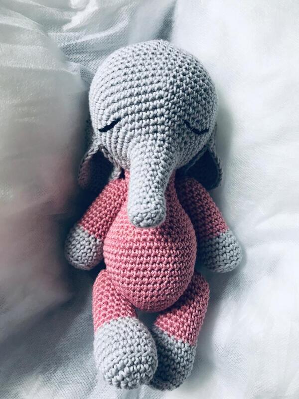 Häkelanleitung für ein süsses, schlafendes rosa Elefantenmädchen mit beweglichen Gliedern. 10 Seiten, bebildert.