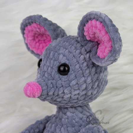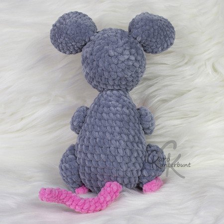 Mit Chenillegarn (120m/100g) wird die Maus ca. 24cm groß. Gemessen bis zur Oberkante der Ohren.