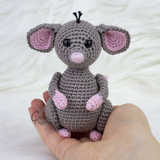 Mit Baumwollgarn (125m/50g) wird die Maus ca. 11cm groß. Gemessen bis zur Oberkante vom Kopf, ohne die Ohren.