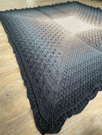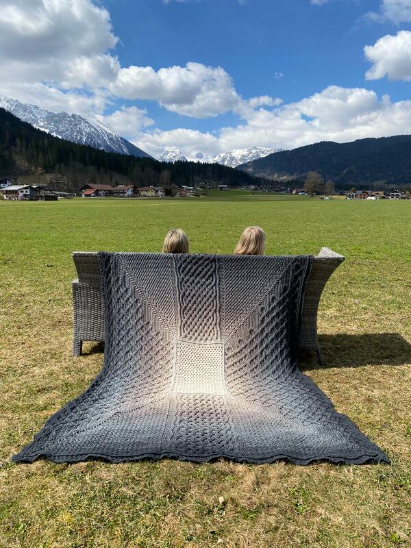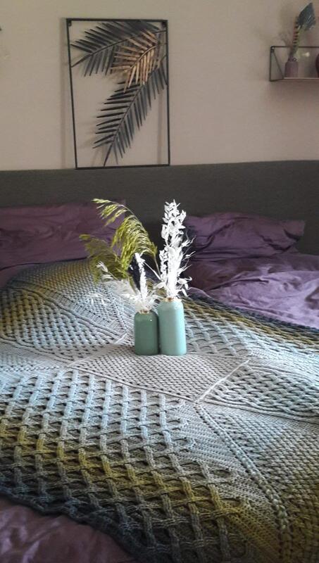 2. Der Mustersatz 1 links und rechts neben Mustersatz 2 hat im Vergleich zu der Decke auf den Bildern einem Versatz von 2 Stäbchen nach Außen hin. Dadurch ergibt sich leider nichts eine klar abgegrenzte Kante zu den Büschelmaschen und der 'Balken' aus Stäbchen zu Mustersatz 2 hin ist breiter.