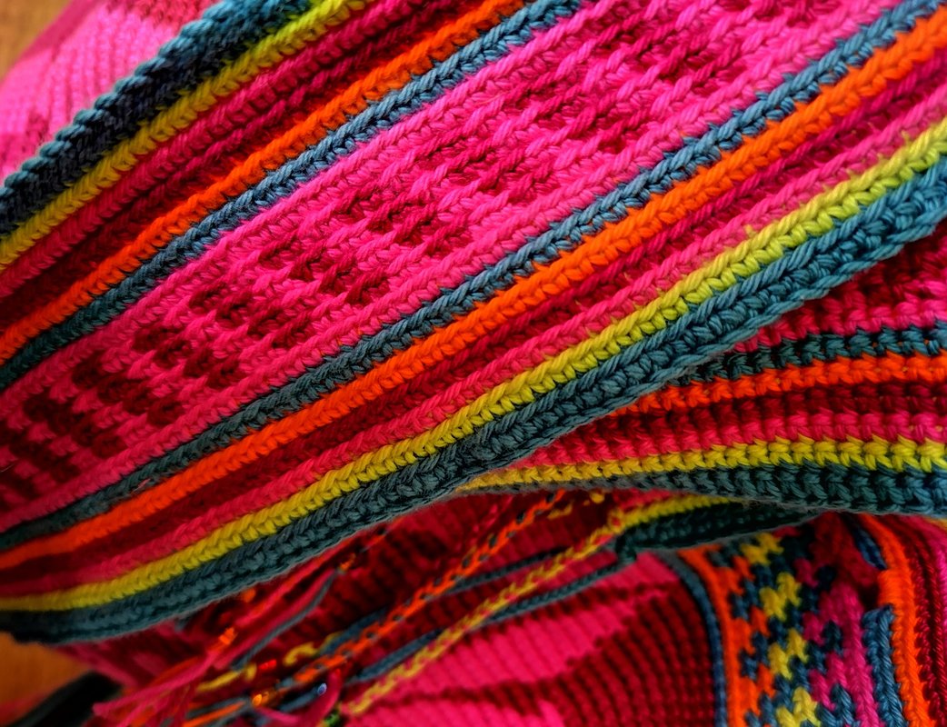 Die Tasche ist aus 100% Baumwolle in der Tapestry-Jacquardtechnik gehäkelt. Eine kurze Einführung in diese Häkel-Technik ist in der Anleitung enthalten, ebenso viele Schritt-für-Schritt-Fotos, die dich beim Arbeiten dieser Anleitung sicher begleiten.
