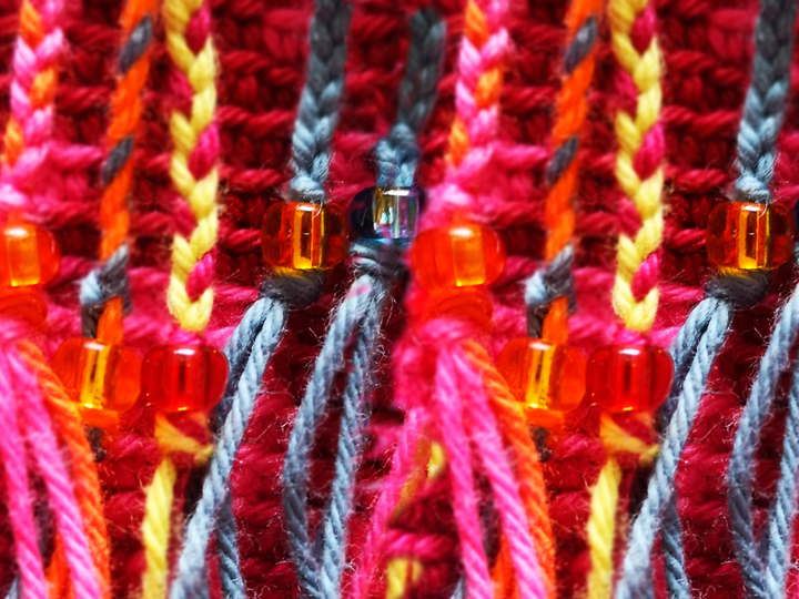 Die Tasche hat einen kreisrunden Boden mit attraktivem Mandala-Muster, der Taschenkörper zeigt die berühmte Bourbonen-Lilie, mal ganz neu interpretiert - ebenfalls in der Tapestrytechnik gearbeitet. Der obere Rand wird mit einer selbst geknüpften Kordel zusammengehalten bzw. verschnürt. Ein langer Trageriemen, ebenfalls mit Muster gehäkelt, ist ebenfalls ein echtes Schmuckelement.
