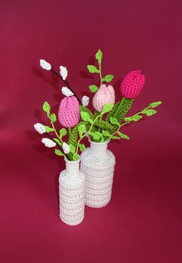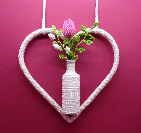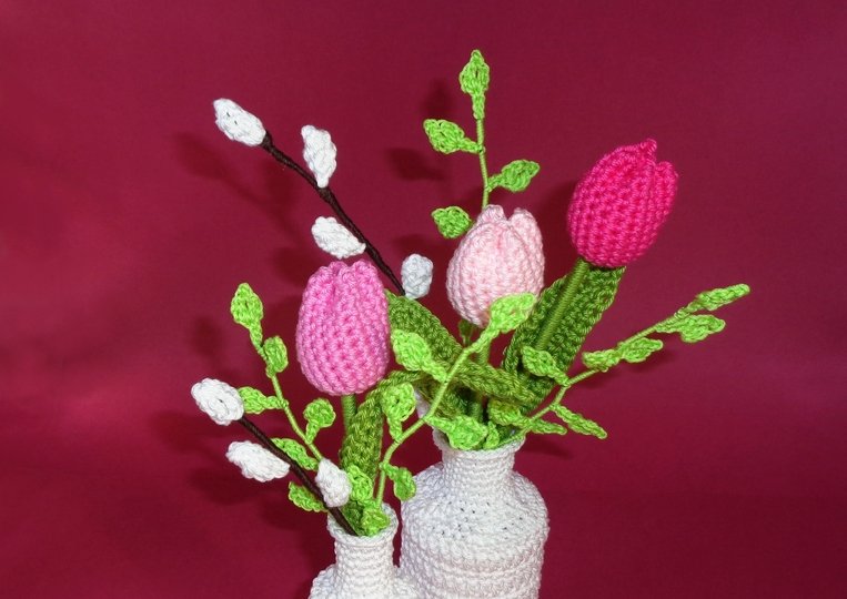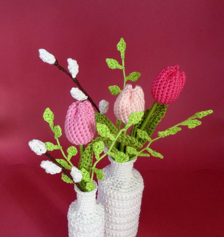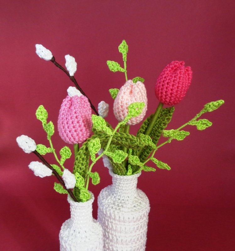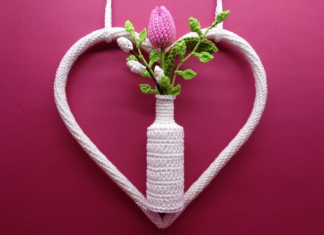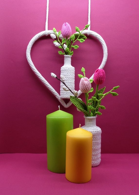 Die Anleitung umfasst zusätzlich zur schriftlichen Häkelerklärung viele, detaillierte Fotos für jedes Element dieser Dekoration (Herz, Vasen in zwei Größen, Weidenkätzchen-Zweige, Zweige mit grünen Blättern und kleine Tulpen) und die Fertigstellung, damit Du diese Dekoration ganz einfach, Schritt für Schritt, erfolgreich nachmachen kannst.