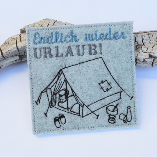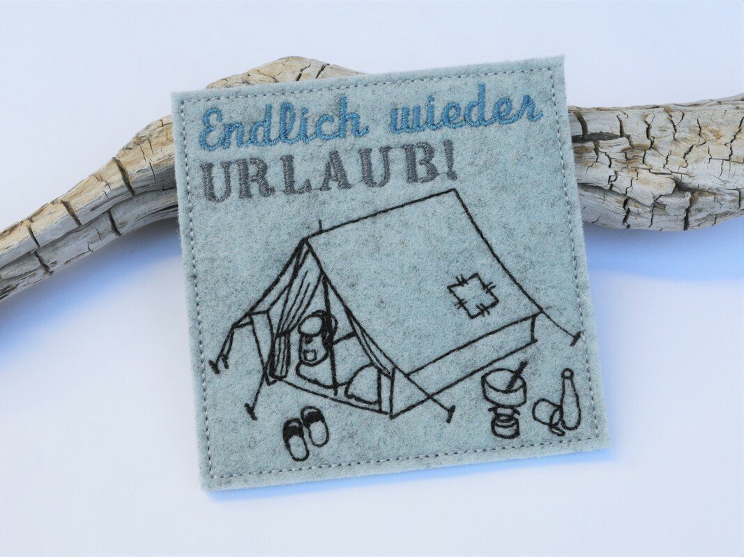 Die kleine Variante für all die, die nur einen 10x10cm Stickrahmen zur Verfügung haben! Ein kleiner Untersetzer für ein Glas oder eine Flasche! Bestickt mit Spruch und Zeltplatz. Der Urlaub kann kommen!