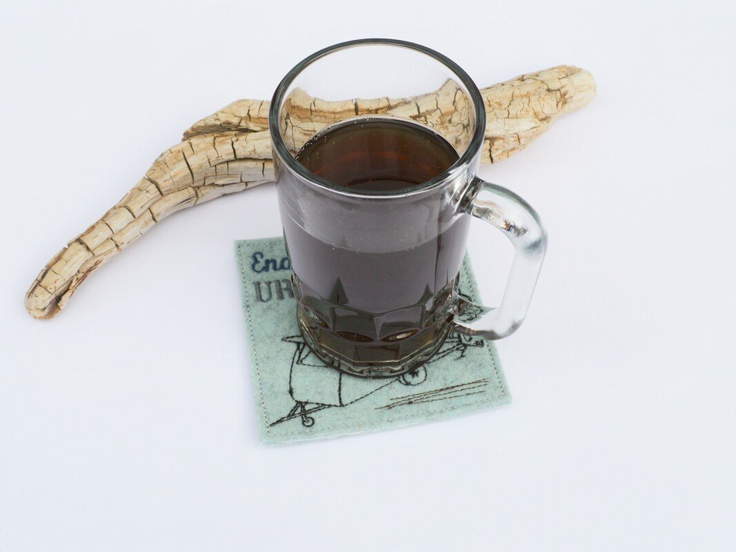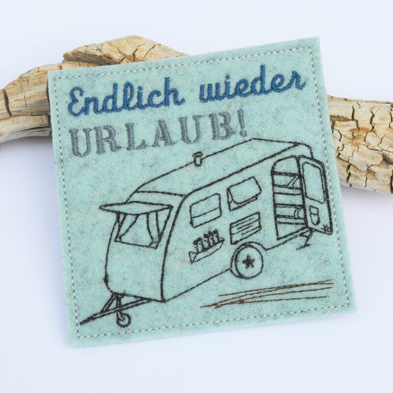 Die kleine Variante für all die, die nur einen 10x10cm Stickrahmen zur Verfügung haben! Ein kleiner Untersetzer für ein Glas oder eine Flasche! Bestickt mit Spruch und Wohnwagen. Der Urlaub kann kommen!