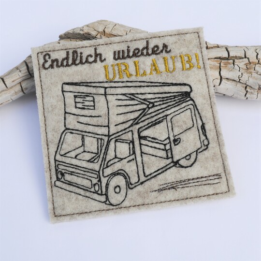 Die kleine Variante für all die, die nur einen 10x10cm Stickrahmen zur Verfügung haben! Ein kleiner Untersetzer für ein Glas oder eine Flasche! Bestickt mit Spruch und Campingbus. Der Urlaub kann kommen!