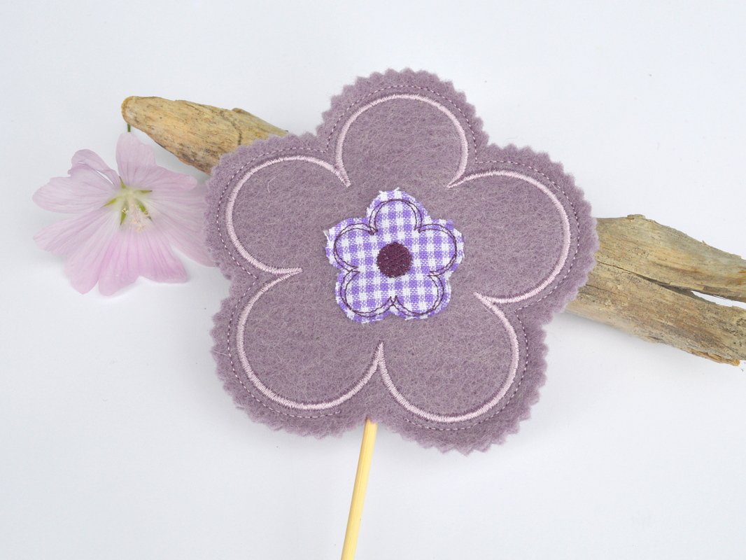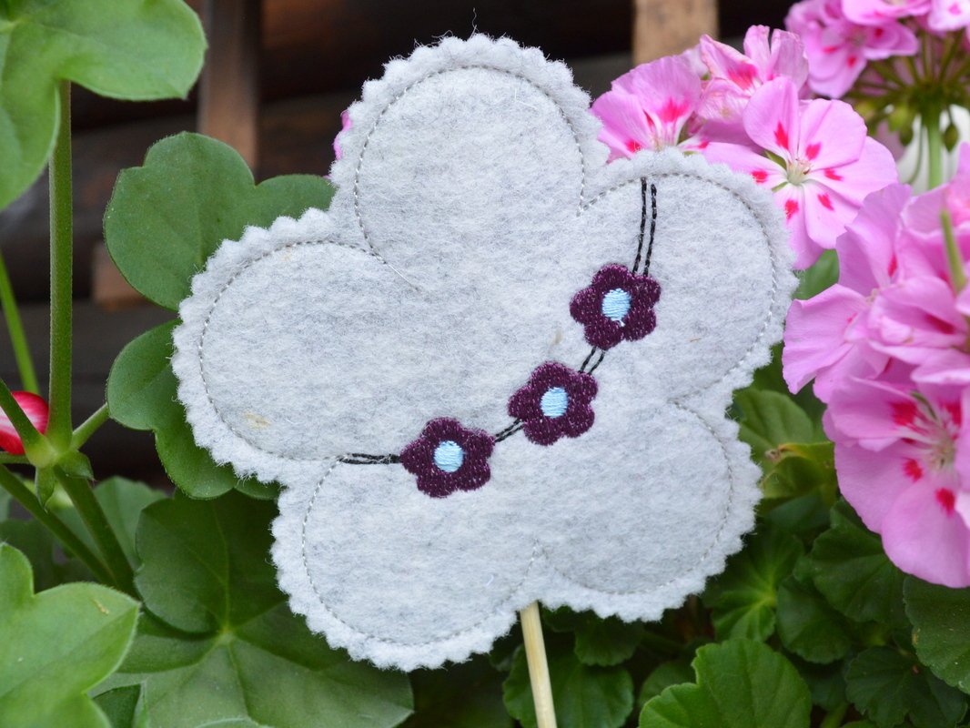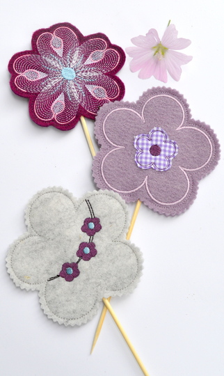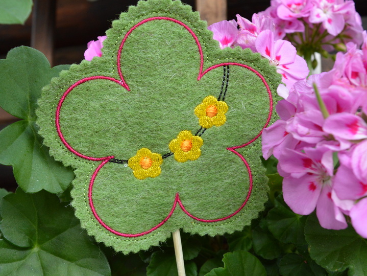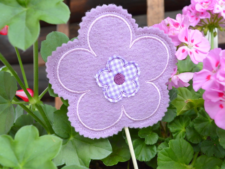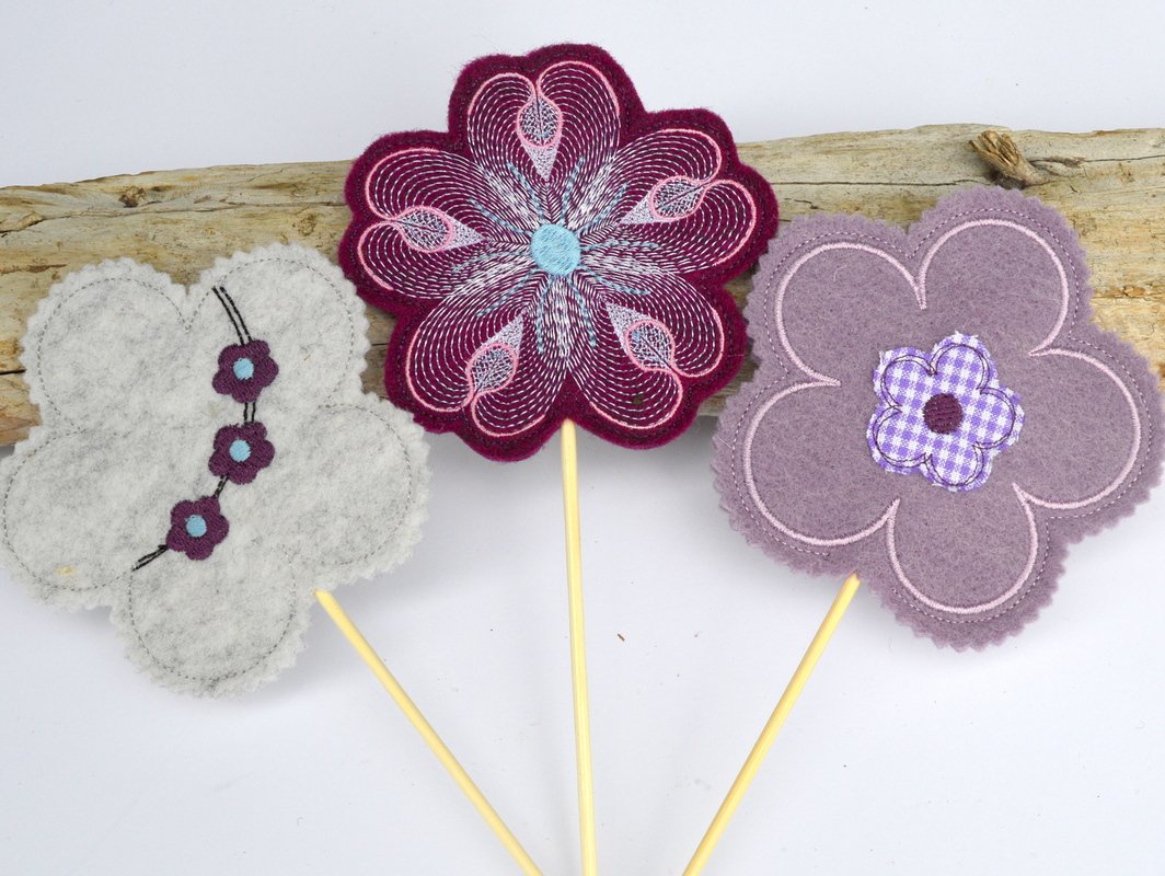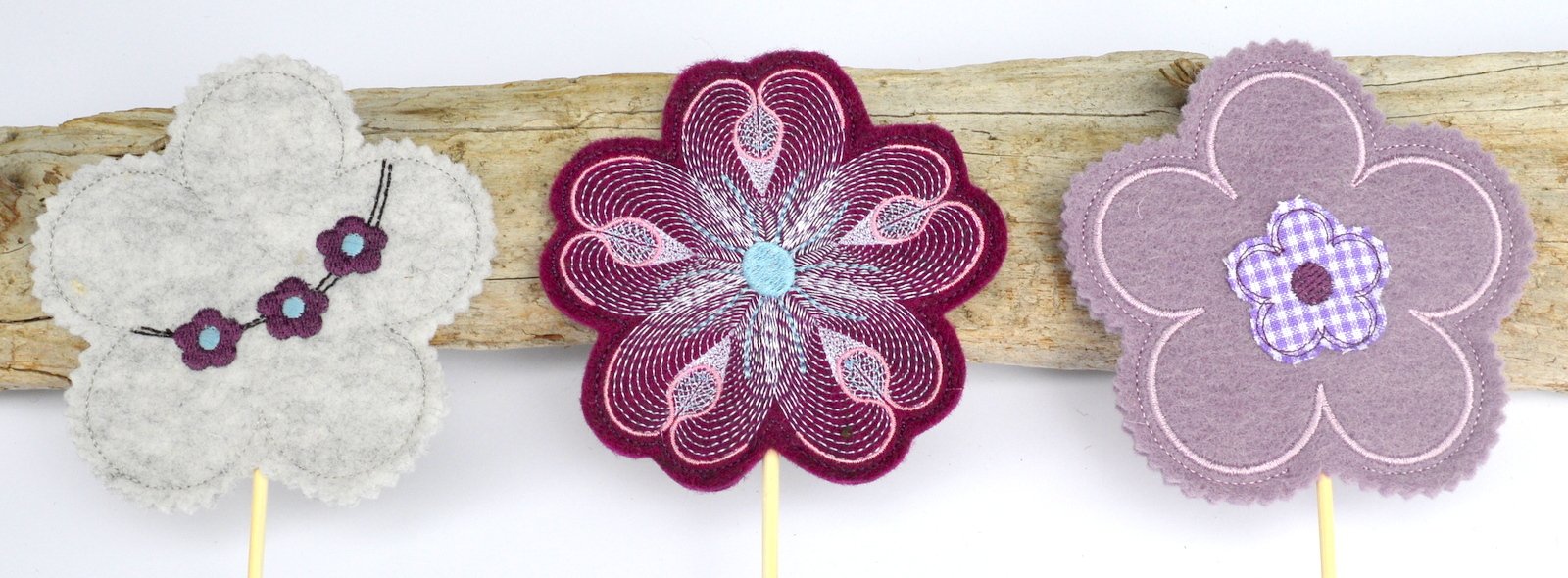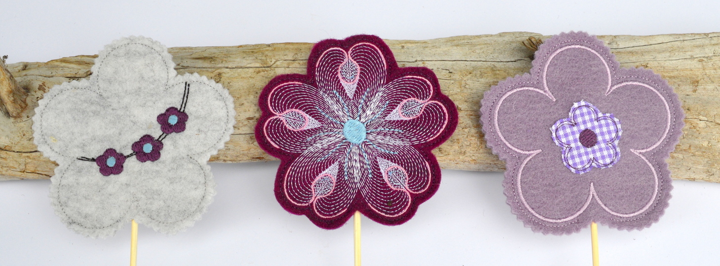 Die Blumenstecker werden komplett im Rahmen von der Stickmaschine gestickt! Ich verwende für die Blumenstecker einen Wollfilz oder Stickfilz, es kann aber auch z.B. (Kunst-)Leder, Jeansstoff oder ähnliches verwendet werden.