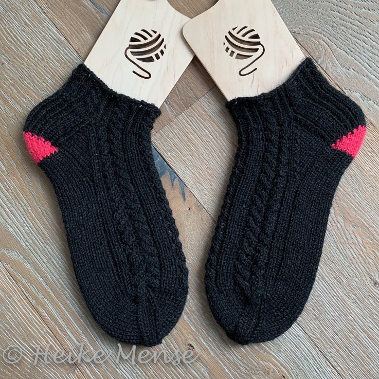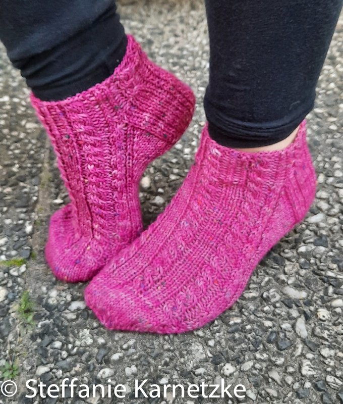 Die PDF Datei enthält die Anleitung für die oben beschriebenen Sneakersocken gestrickt aus 6fach Sockenwolle.