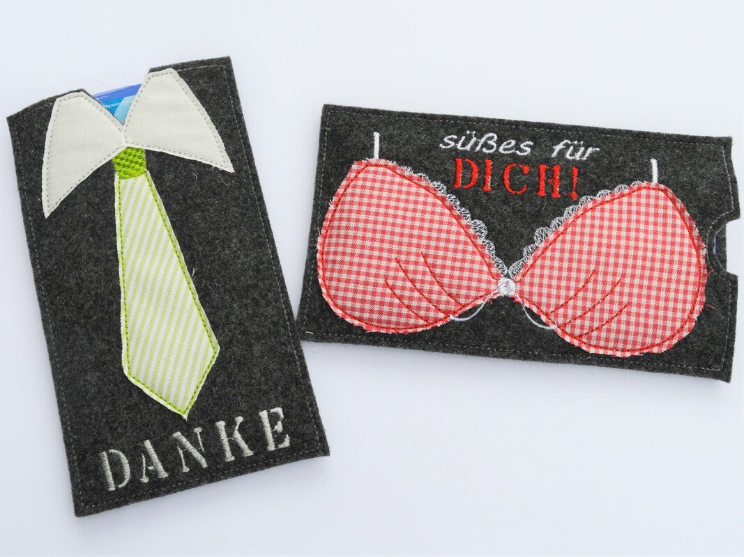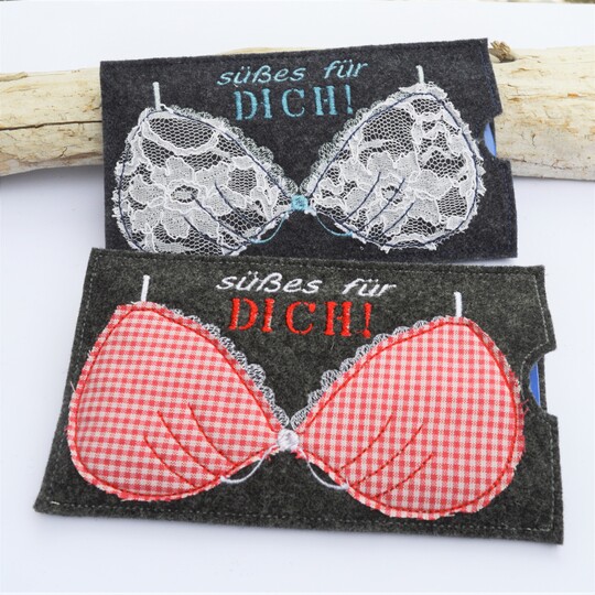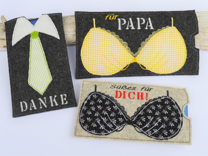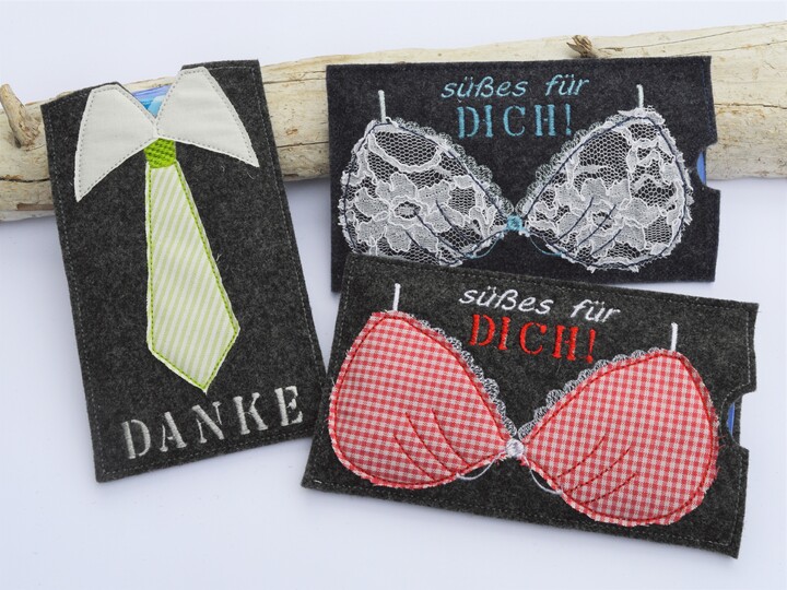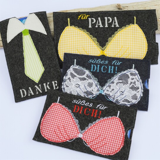 ITH Stickdatei für Schokohüllen mit den Motiven "BH" und "Krawatte".