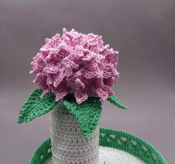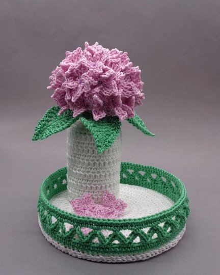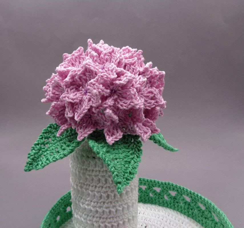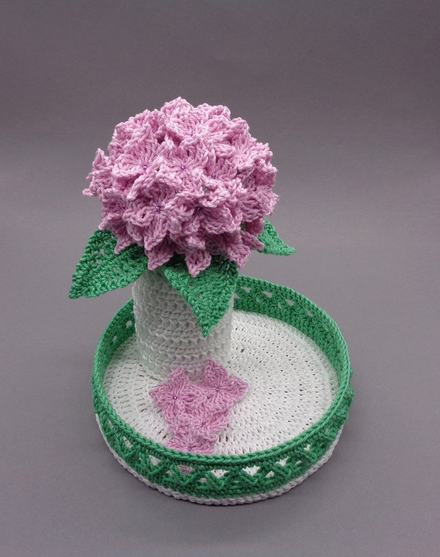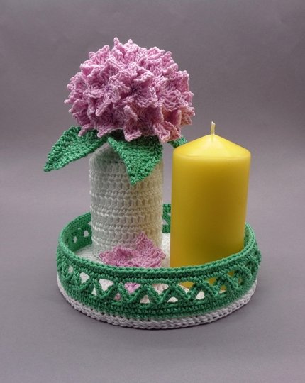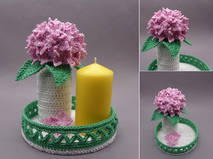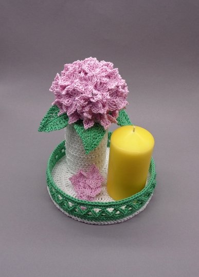 Das runde Tablett mit 3D-Häkelrand und die schlichte, moderne Vase setzen die Blüten der Hortensie in Deinem Zuhause perfekt in Szene und können natürlich auch einzeln oder mit Kerze dekoriert werden.