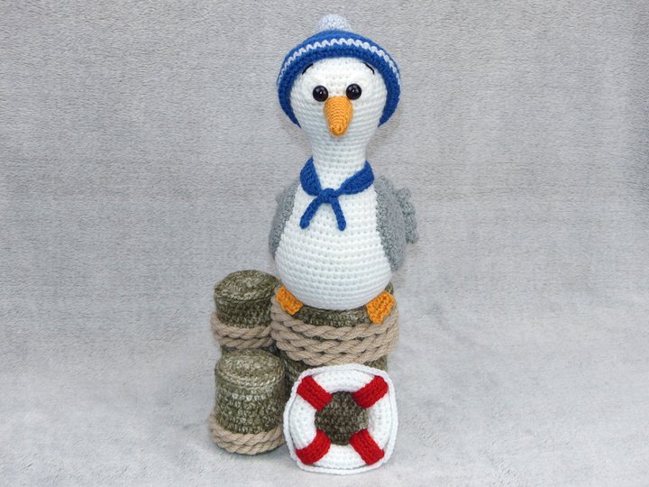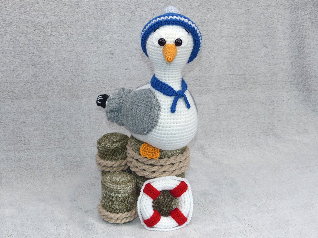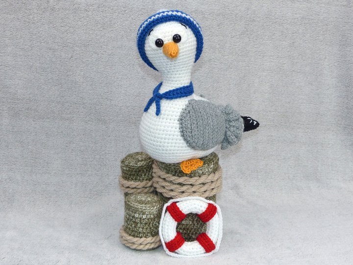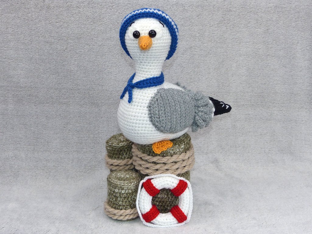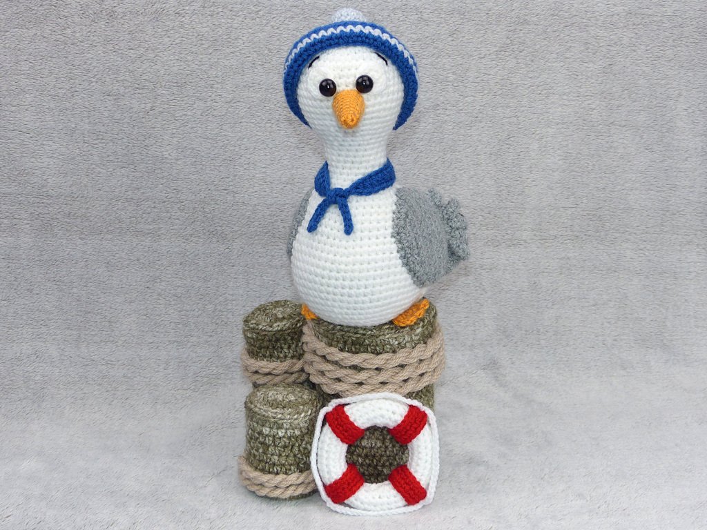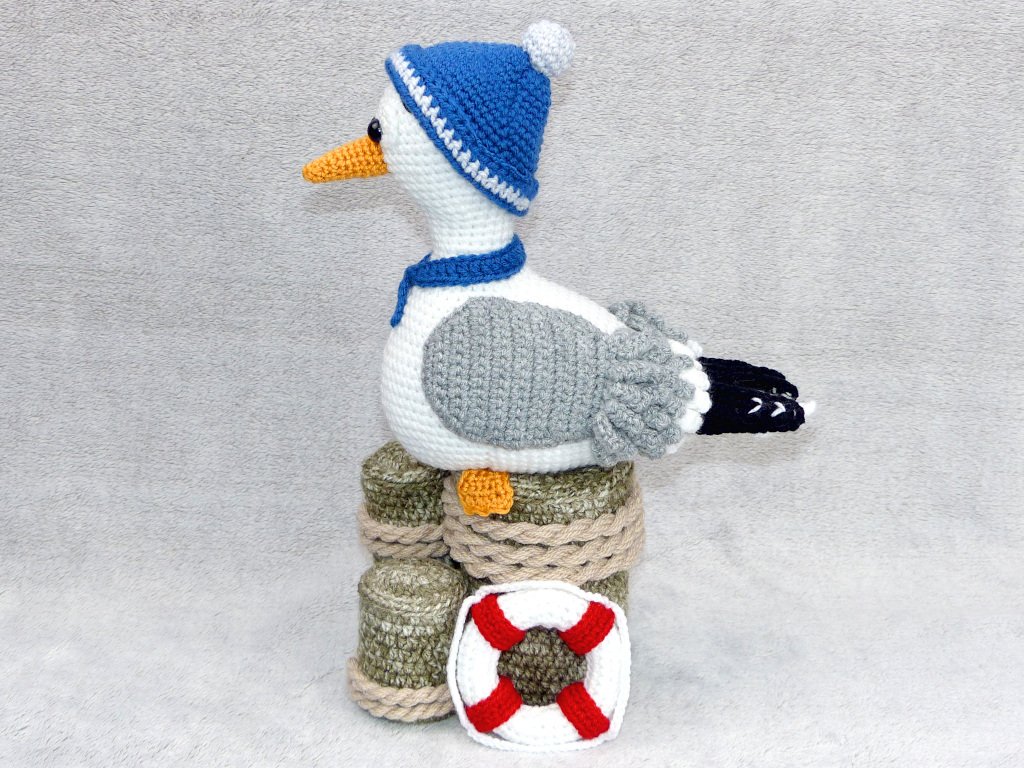 Ich beschreibe euch in der Anleitung wie die Möwe, die Holzpoller und der Rettungsring gehäkelt wird.