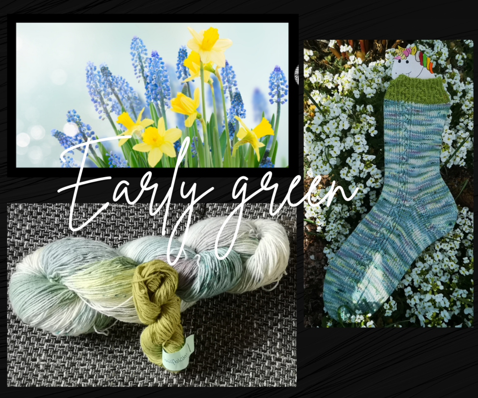 Early green ist ein einfaches ber wirkungsvolles Muster für Socken, das sich oben am Bündchen um den ganzen Fuß legt um dann an der Außenseite des Fußes bis zur Spitze zu laufen.