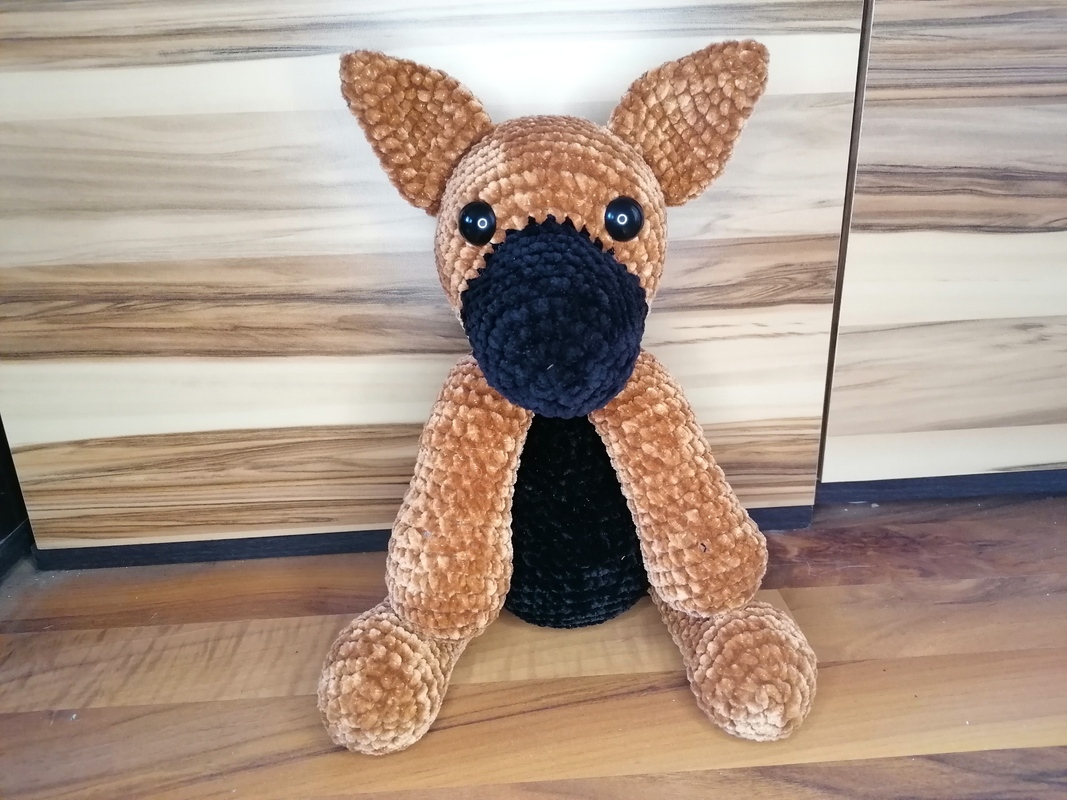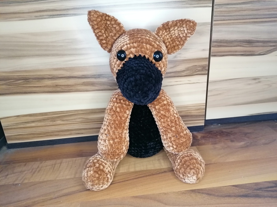 Durch das Garn ist der Schäferhund super weich und ein geniales Kuscheltier für Kinder oder eine süße Deko für die Couch.
