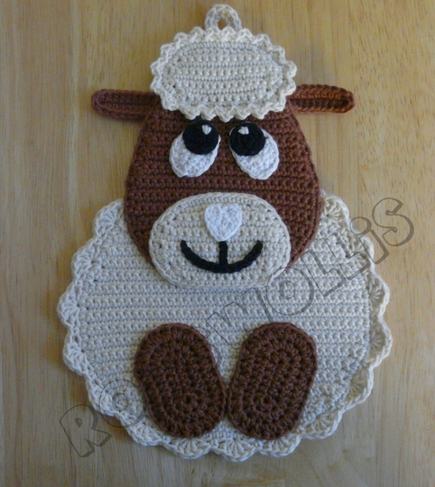 Olli das Schäfchen als süßer Topflappen der sehr nützlich in der Küche ist, aber sich auch prima an der Wand oder Tür macht.