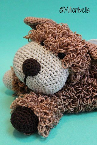 Die meisten Teile dieses Hundes werden in fortlaufenden Runden gehäkelt. Nur der Schwanz wird in Reihen gearbeitet. Oben befindet sich eine Öffnung zum Einsetzen einen Taschentuchpaket und schließt mit 2 Knöpfen.