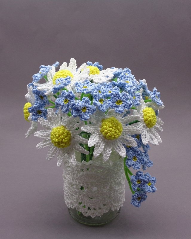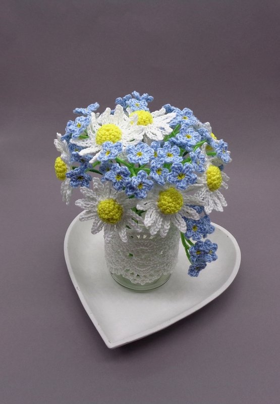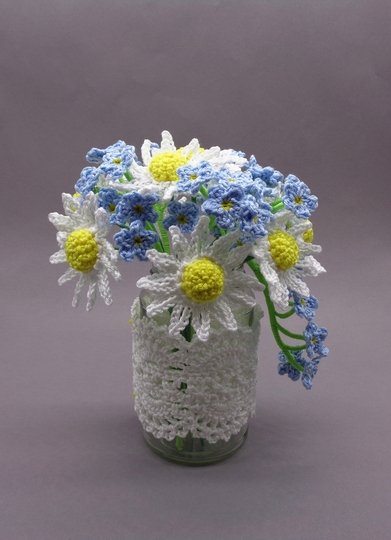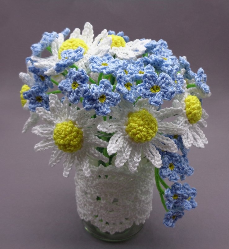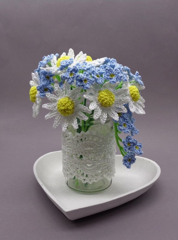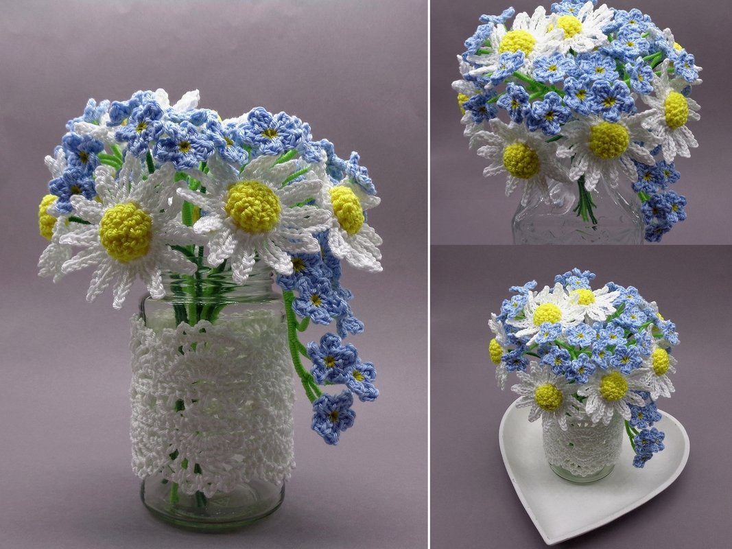 Die zartblauen Vergissmeinnicht-Blüten und die weißen Margeriten versprühen einen unbekümmerten und leicht wirkenden Charm. Das macht diese Häkel-Deko zu einem schönen Blickfang in Deinem Zuhause.