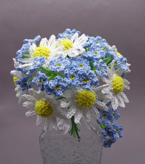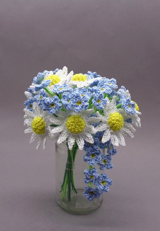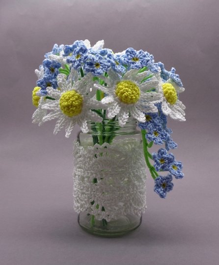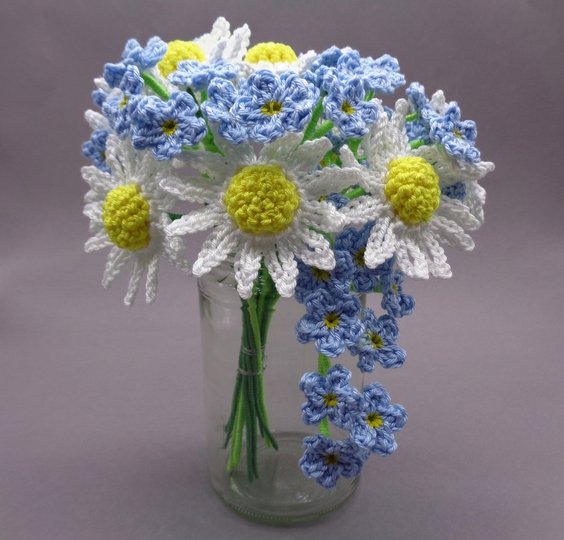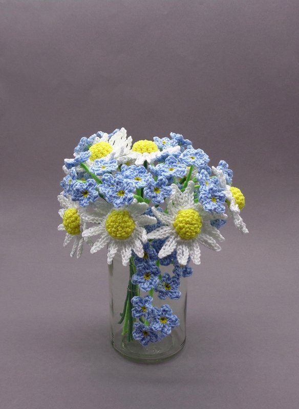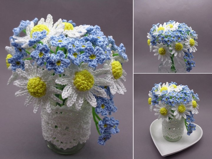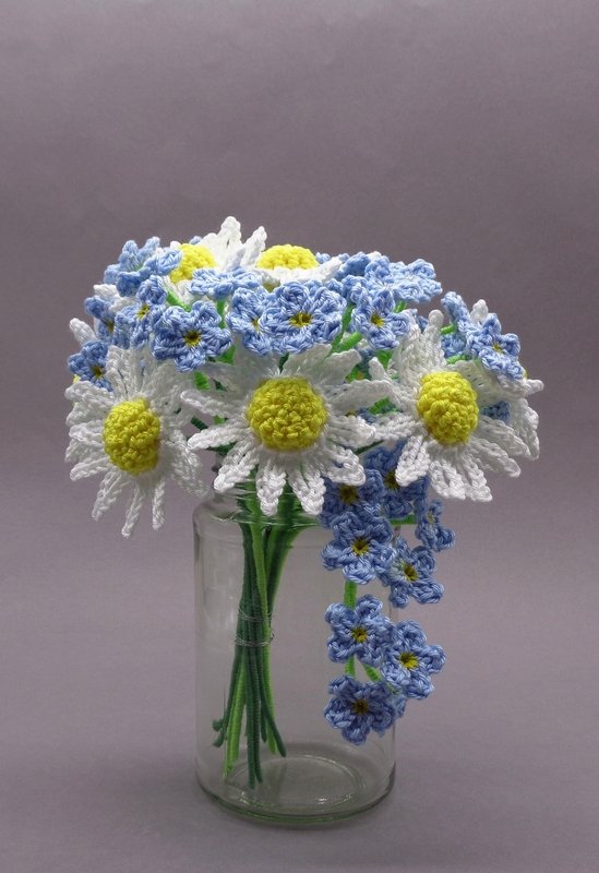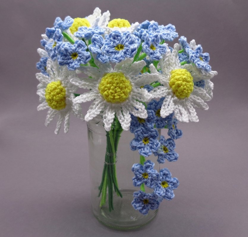 Die zartblauen Vergissmeinnicht-Blüten und die weißen Margeriten versprühen einen unbekümmerten und leicht wirkenden Charm. Das macht diese Häkel-Deko zu einem schönen Blickfang in Deinem Zuhause.