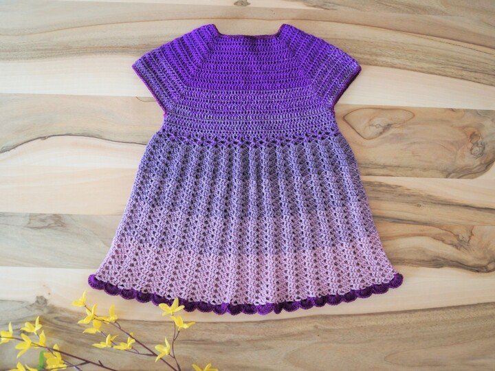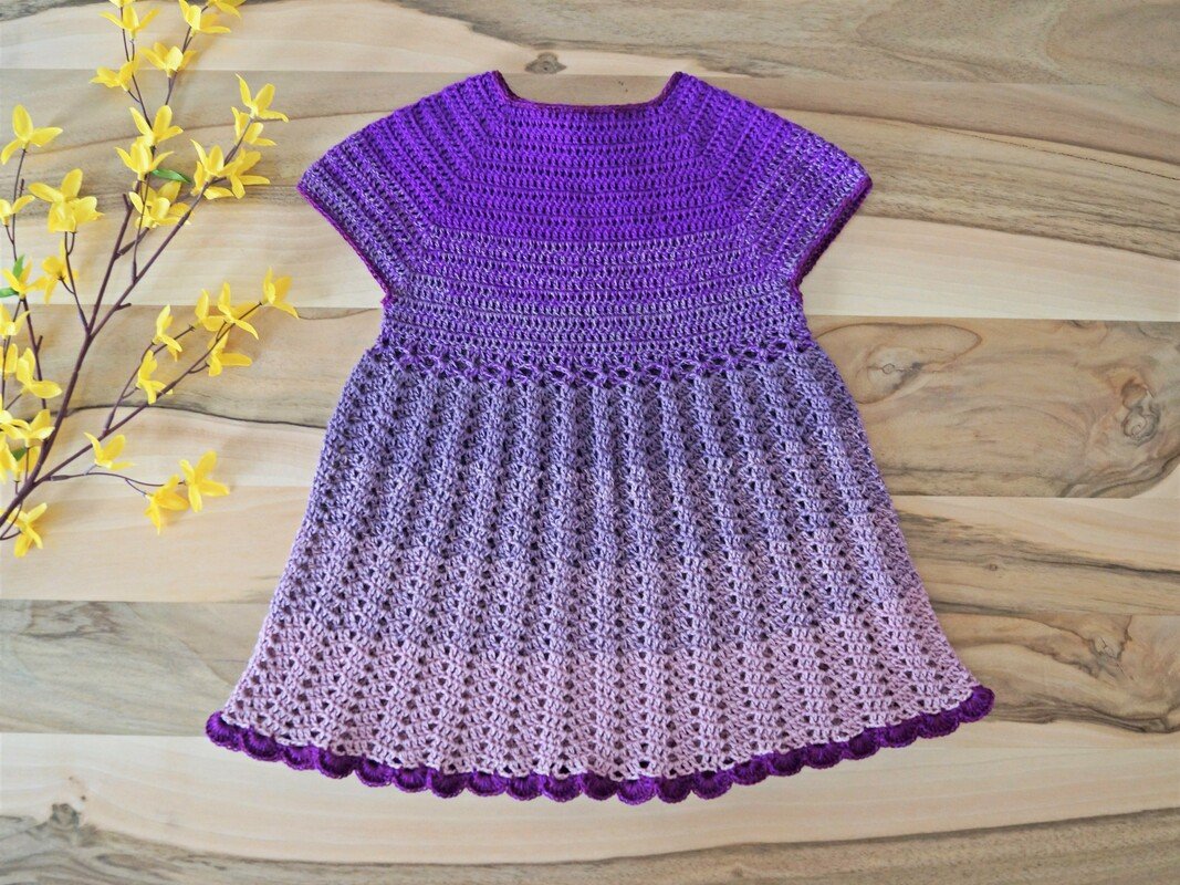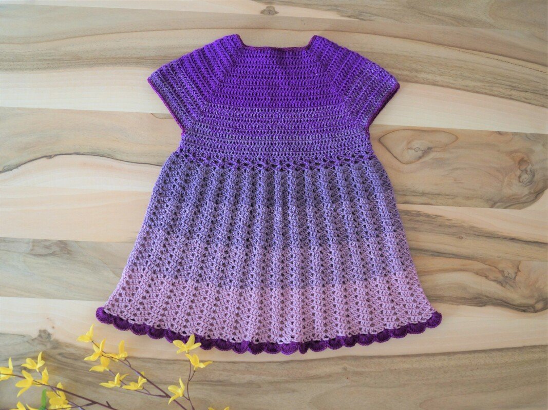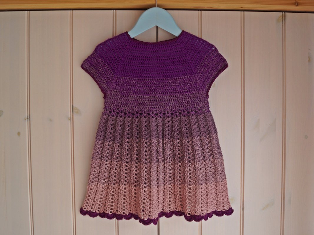 Dieses süßes Kleid (in Größe 62-98) wird an einem Stück von oben nach unten gearbeitet (Raglan von oben), somit perfekt für Farbverlaufsgarne geeignet. Im Rücken ist eine Knopfleiste eingearbeitet.