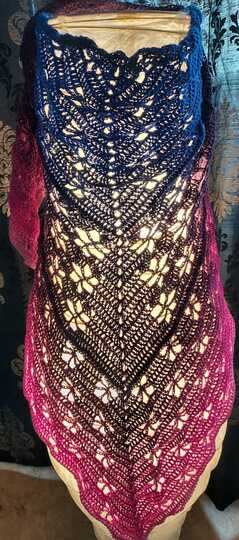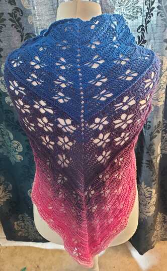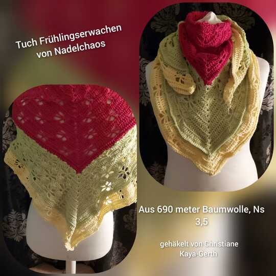 Dies Tuch besteht aus zwei Verschieden Mustern das eine sind Schmetterlinge, das ander sind Blüten. Durch die Musterkombie scheind es so das die Schmetterling die Blüten umgarnen.