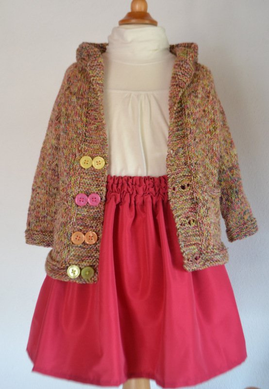 Die Jacke wird auf ab der Halsblende von oben nach unten gestrickt (RVO). Die Ärmel werden mit einem Nadelspiel gestrickt und man hat somit keine Nähte.