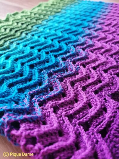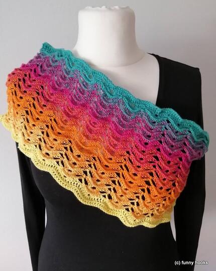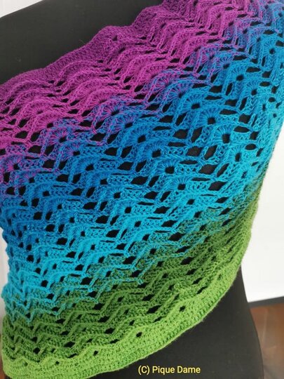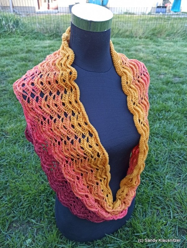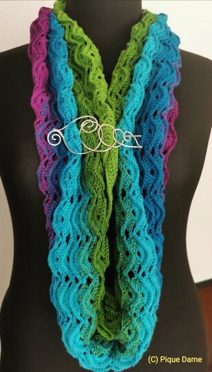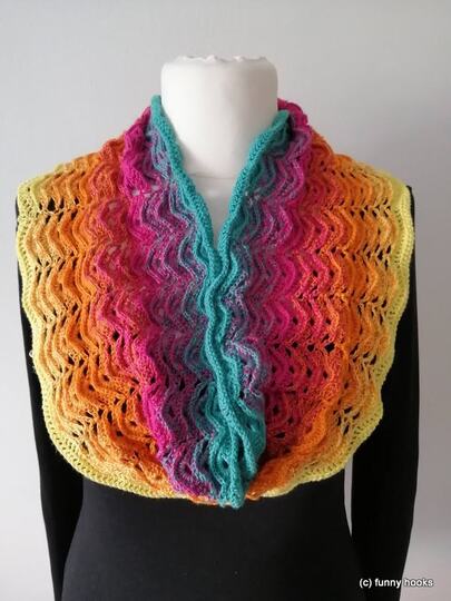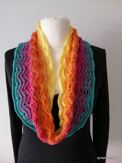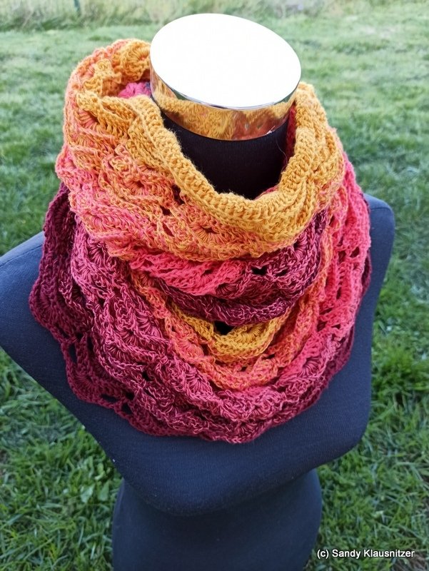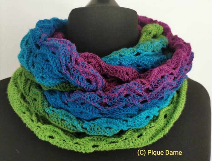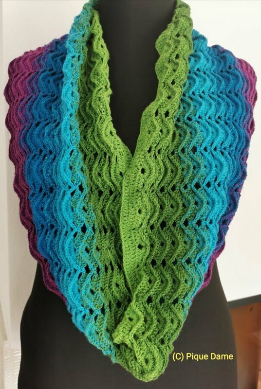 “Merak” ist der kleine Bruder vom “pafugl”. Merak bedeutet ebenfalls Pfau auf Javanisch. In der Tunika Pafugl gibt es das tolle Muster 3 und dieses ist viel zu schade, um es nur als Tunika zu arbeiten. Deshalb kommt hier der “Pfau” in Loop-Form.